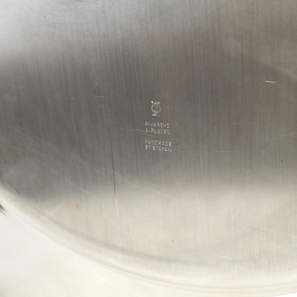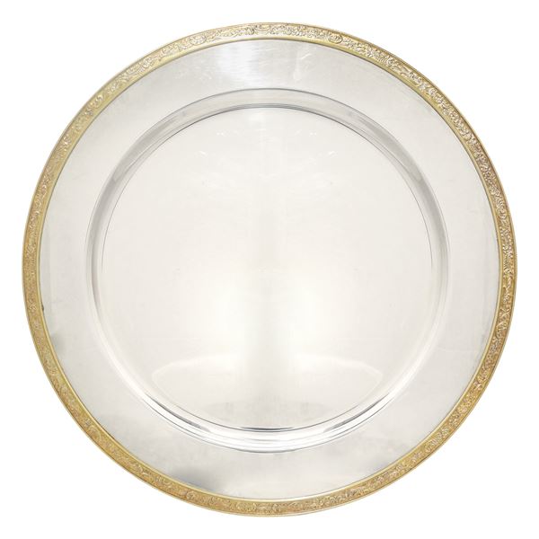 Centrotavola silverplated con bordo dorato e decorato a rilievo composto da piatto e sottopiatto