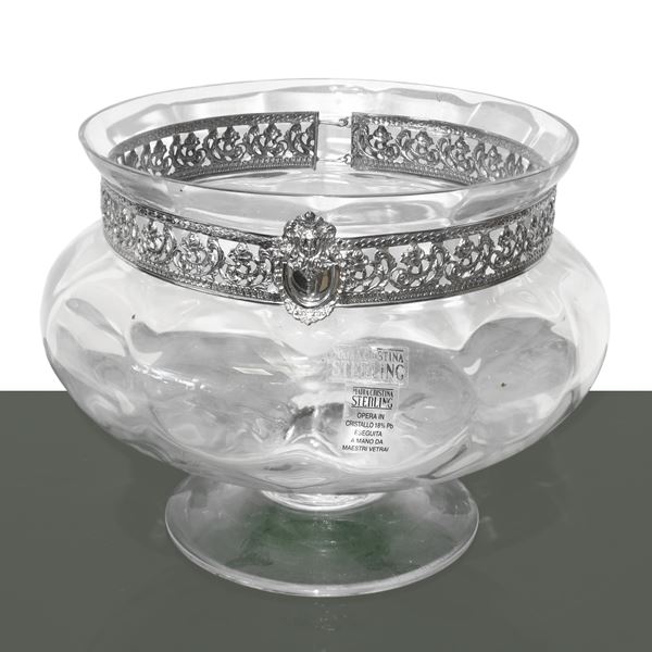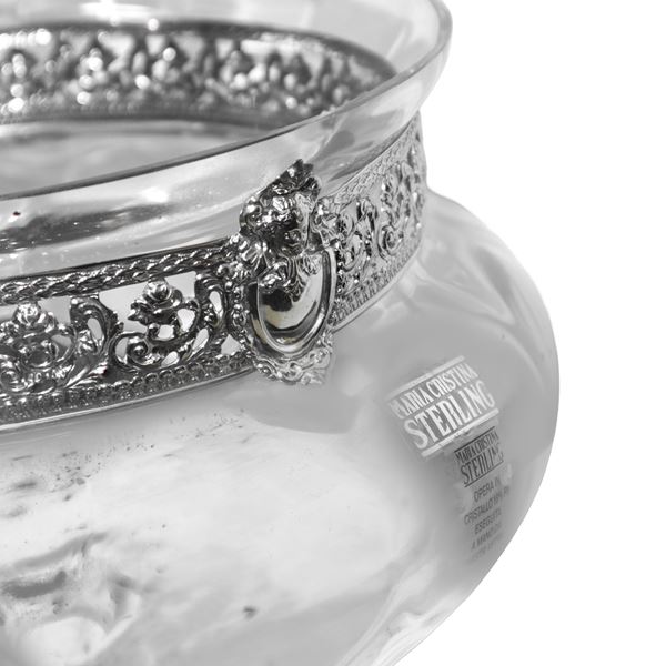 centrotavola in cristallo con bocca fascetata in argento sterling a motivi floreali