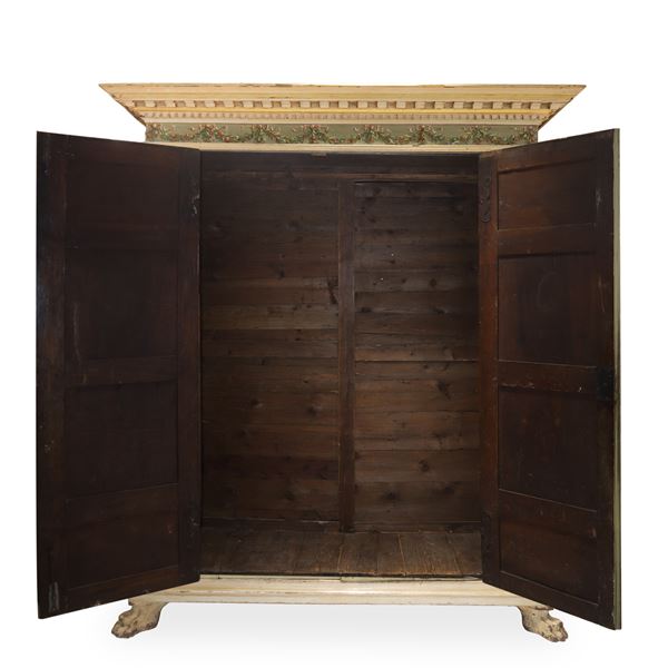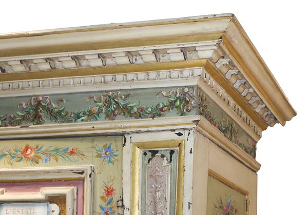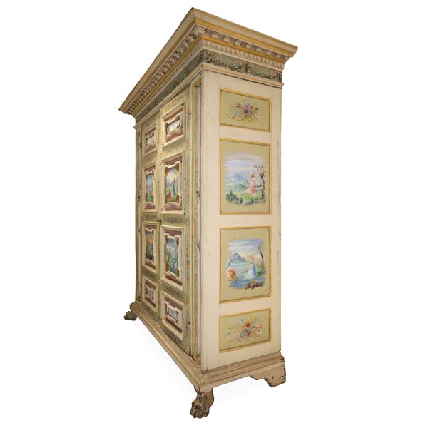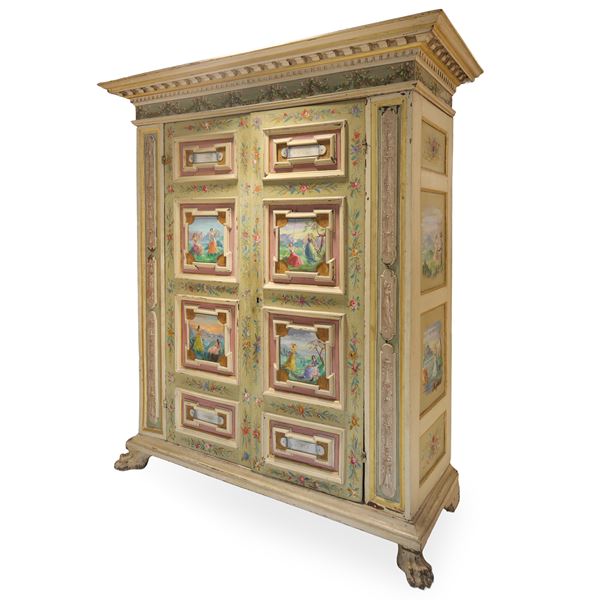 Armadio a due ante laccato e dipinto con quattro formelle per anta dipinte con scene di figure femminili, cappello dentellato di forma aggettante e piedi felini, Marche XIX secolo