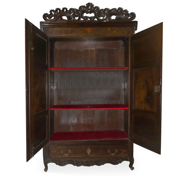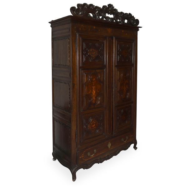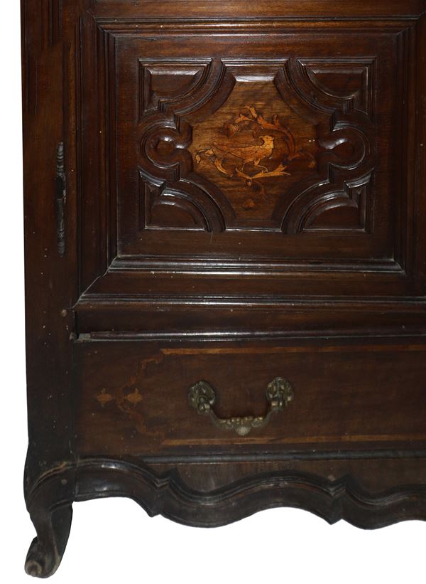 Armadio catalano Luigi XIV con intagli e intarsi agli sportelli e cassetto alla base, XVIII secolo
