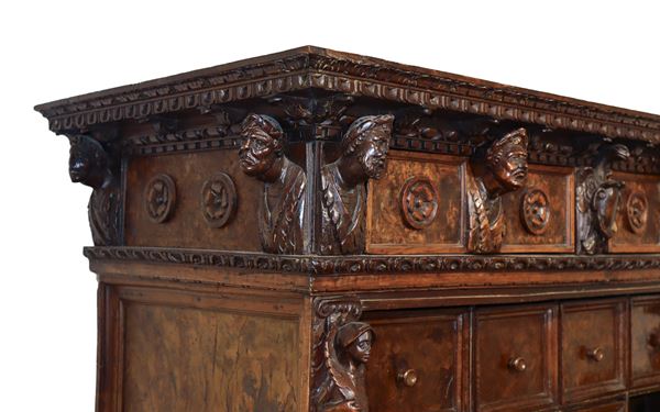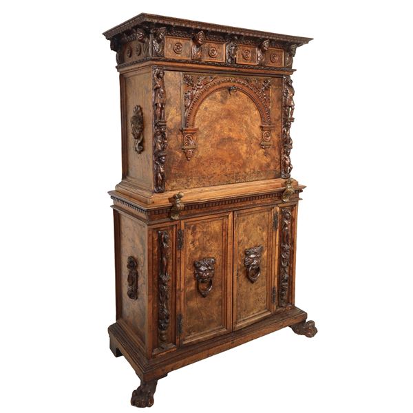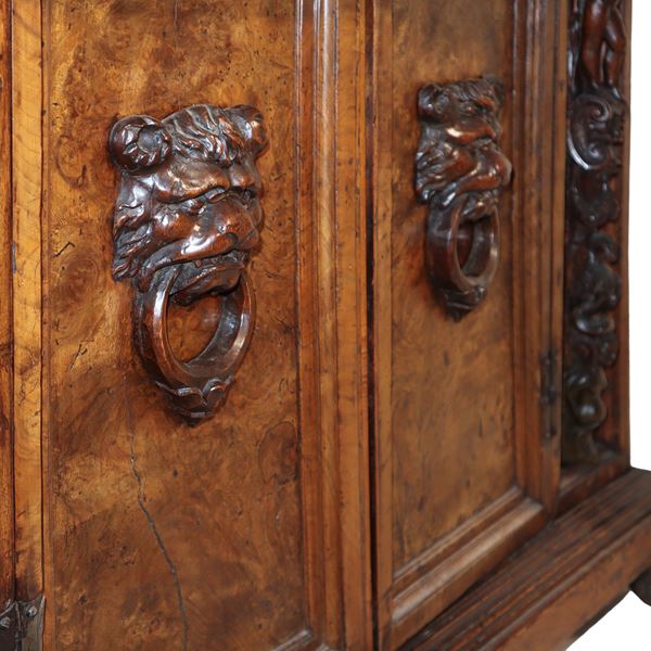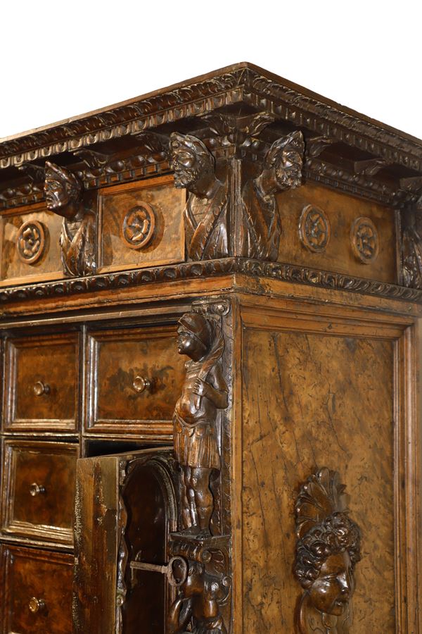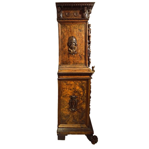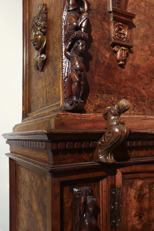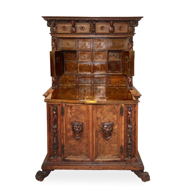 Cabinet rinascimentale a doppio corpo in legno di radica di noce, Genova, fine XVI/XVII secolo
