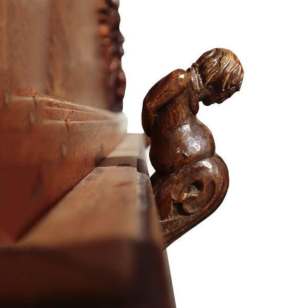 Il mobile in questione presenta entrambe queste caratteristiche, motivo per cui possiamo cronologicamente portlo alla fine del XVI/ XVII secolo, opera dei maestri intagliatori che facevano parte della Corporazione dei Bancalari la cui fondazione risale alle metà del XIII secolo.