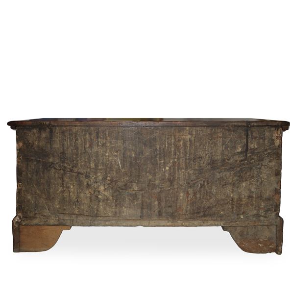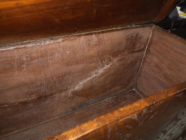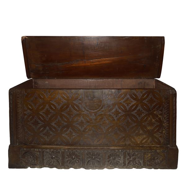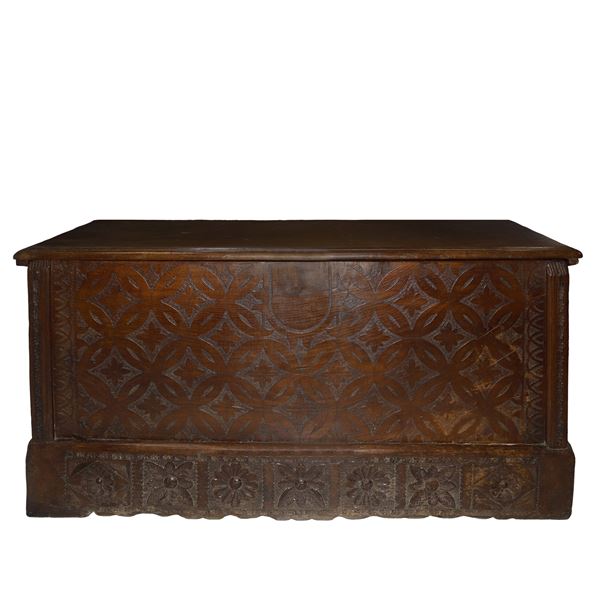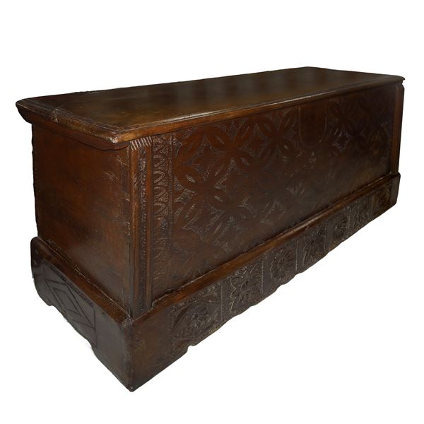 Cassapanca sarda campidanese in legno di noce sul fronte e sui lati bulinata e intagliata a motivi vegetali, lateralmente lesene scolpite e ala base dei lati grandi losanghe, XVIII secolo