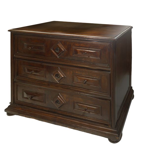 Cassettone a 3 cassetti bugnati e scolpiti a rettangolo ai lati e a losanga al centro con bocchetta chiara, piedi a cipolla schiacciata., XVII Secolo