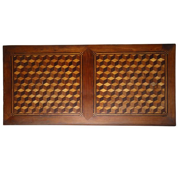 In legno di noce lastronato a damiere in legni chiari di acero e legni scuri di palissandro. Piedi troncopiramidali, 2 cassetti. Piccole mancanze
