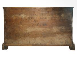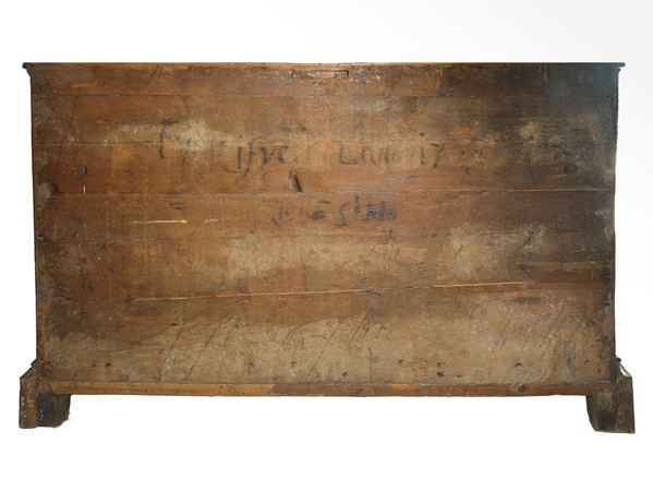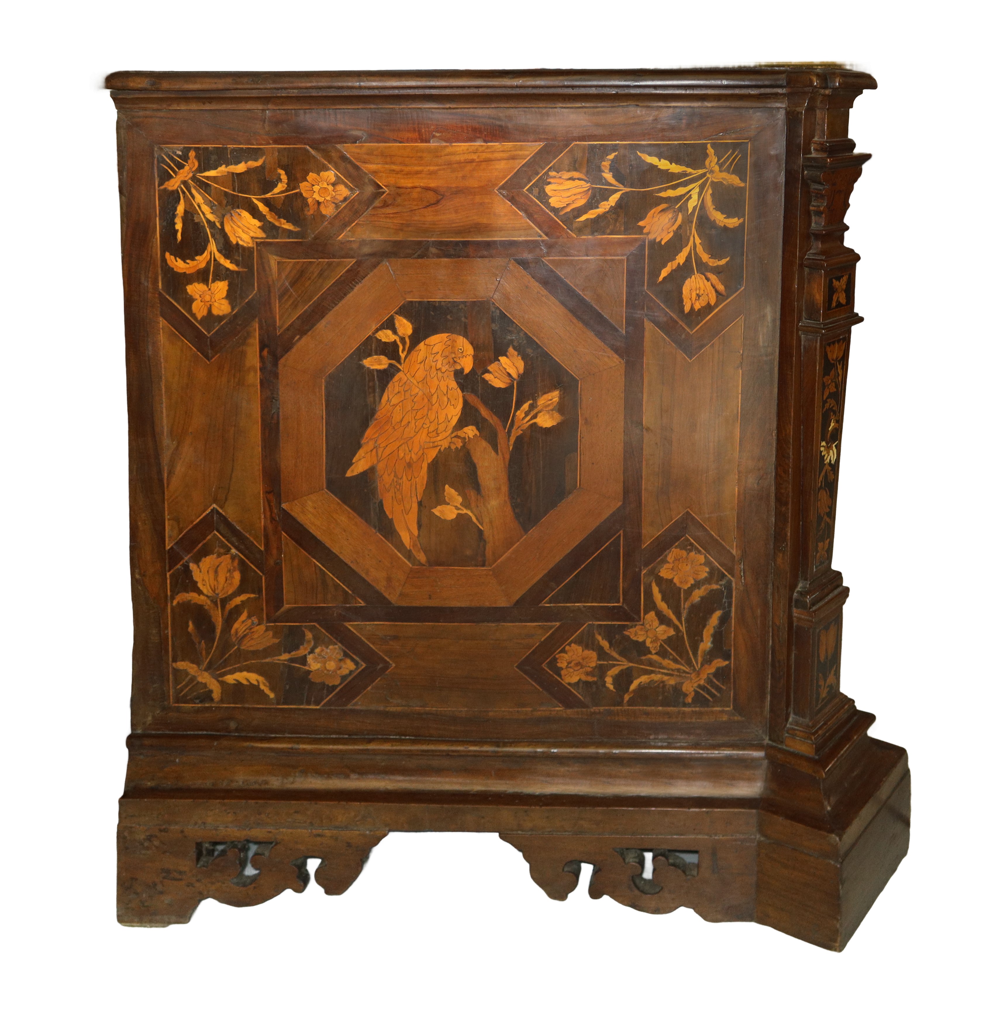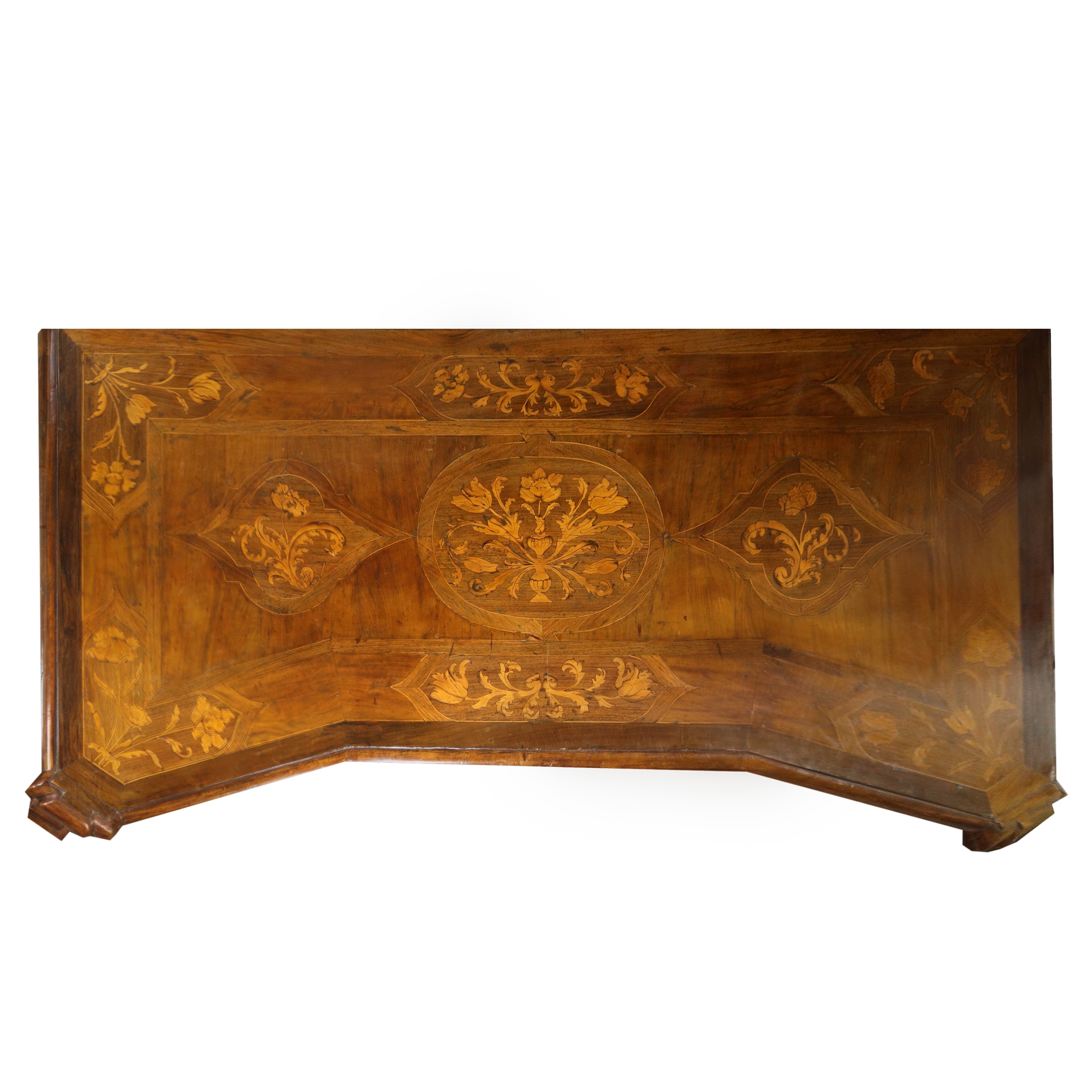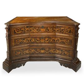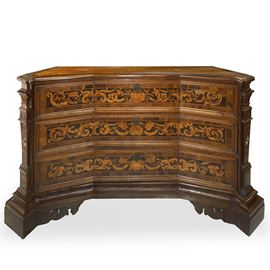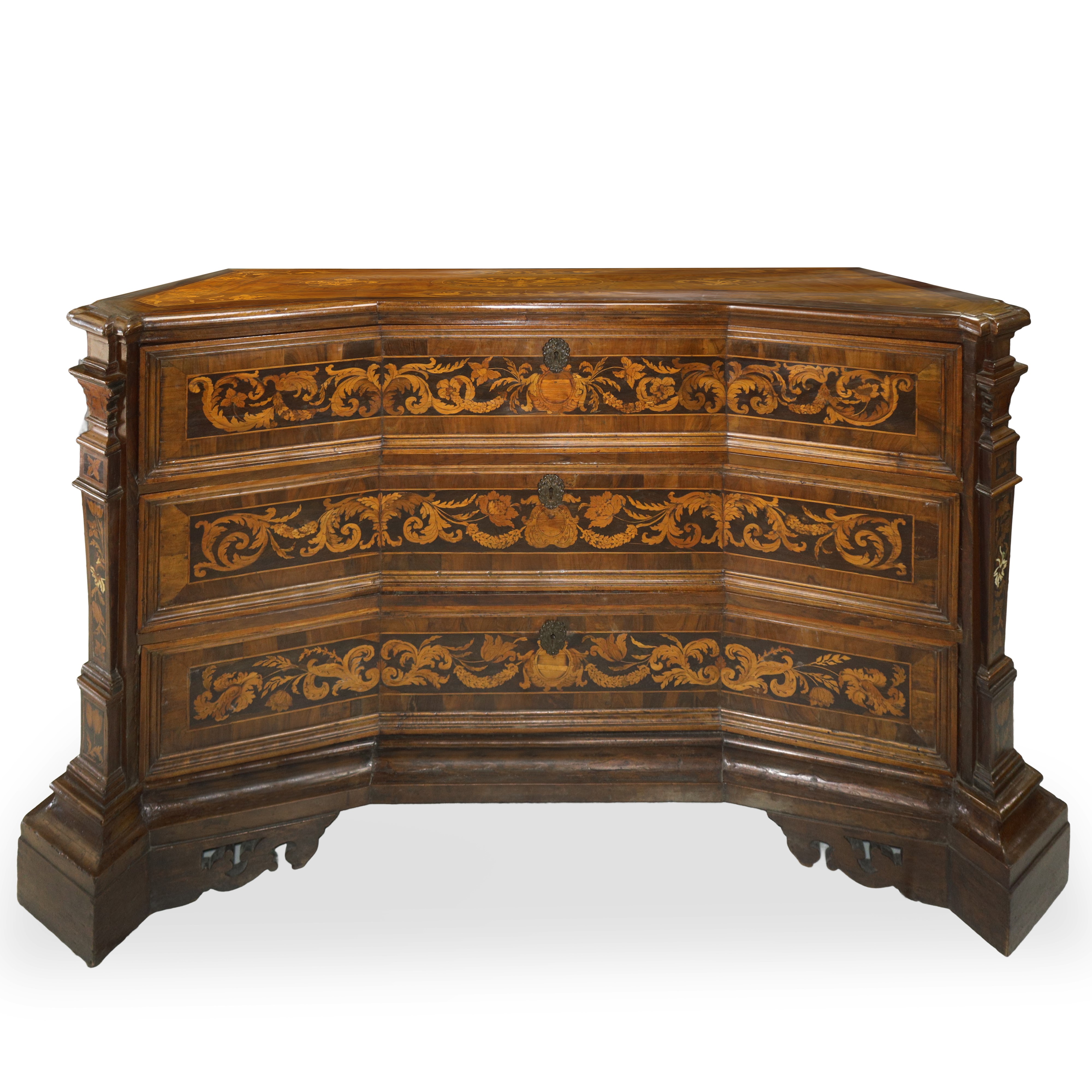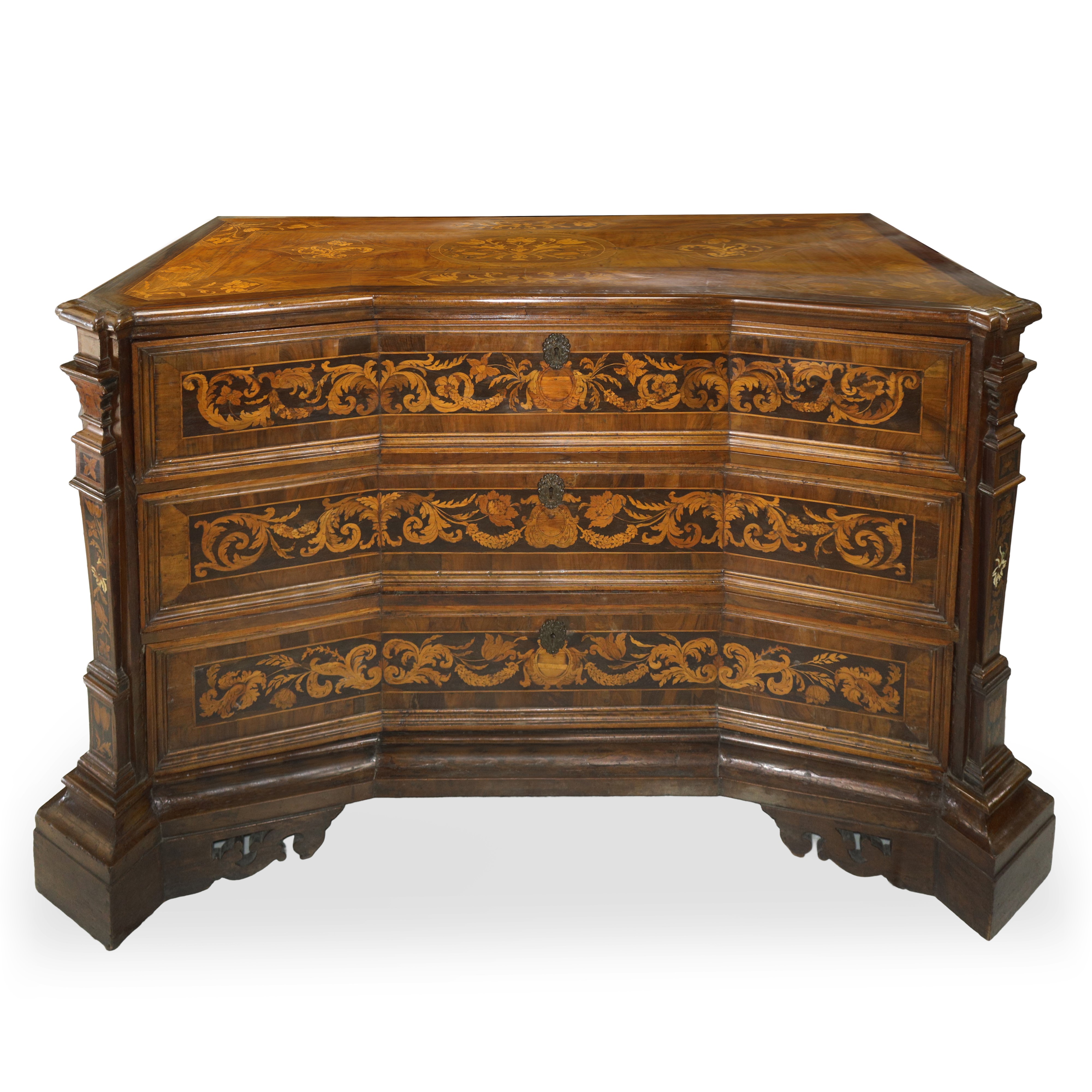 Cassettone veneto in legno di noce intarsiato con legni di acero, palissandro ed ebano piano di forma sagomata ed angoli scantonati, tre cassetti interamente intarsiati a motivi di ghirlande lati intarsiati a motivi fogliari con grandi uccelli entro tarsie rettangolari, piano interamente intarsiato in legni chiari, Veneto fine XVII secolo
