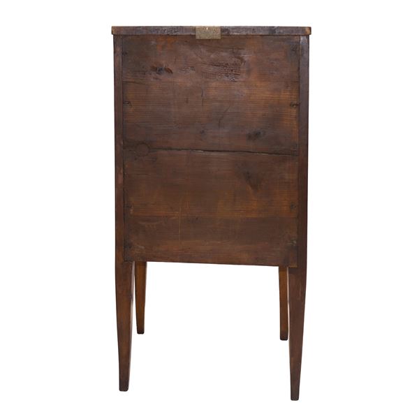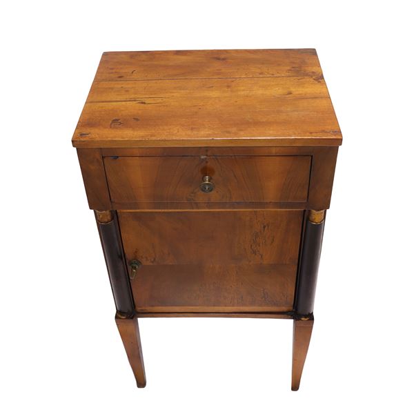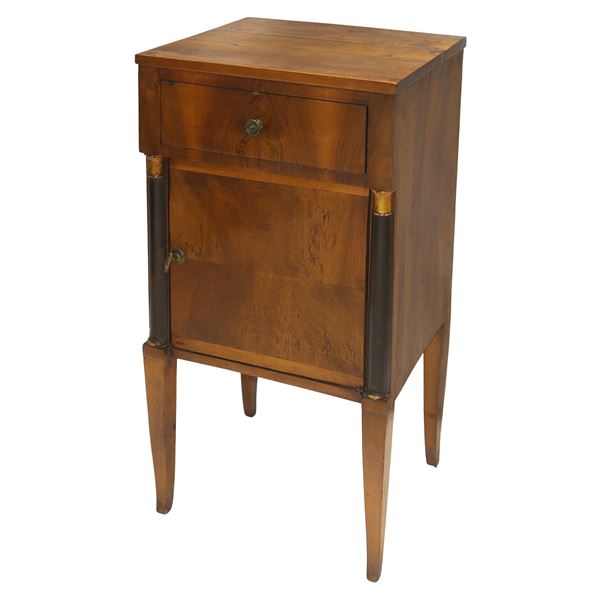 Comodino Direttorio in legno di noce con colonne ebanizzate nere ai lati, piedi troncopiramidali, fine XVIII