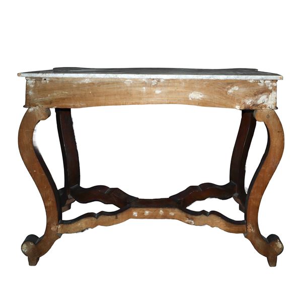 Consolle Luigi Filippo in legno di noce marmo al piano fronte intagliato gambe curve intagliate raccordate alla base da traverse convergenti al centro, XIX secolo