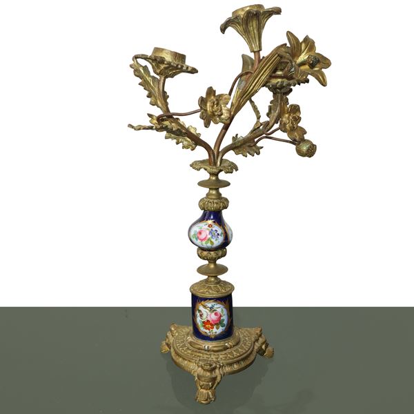 Coppia di candelieri a 3 luci in metallo dorato e porcellana di Sevres