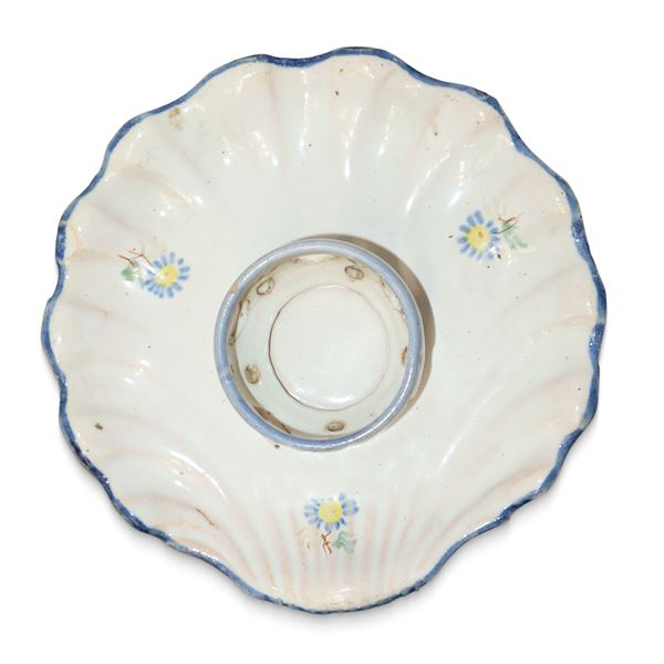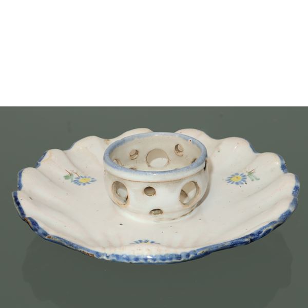Coppia di mancerine in ceramica di Alcora bianca con dettagli floreali e bordo azzurro, XVIII/XIX secolo