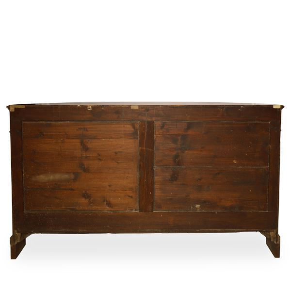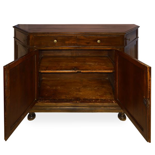 Credenza bassa in legno massello di noce scantonata ai lati con cassetti nella parte superiore e sportelli nella parte inferiore e piedi a cipolla schiacciati, Veneto fine XVIII secolo