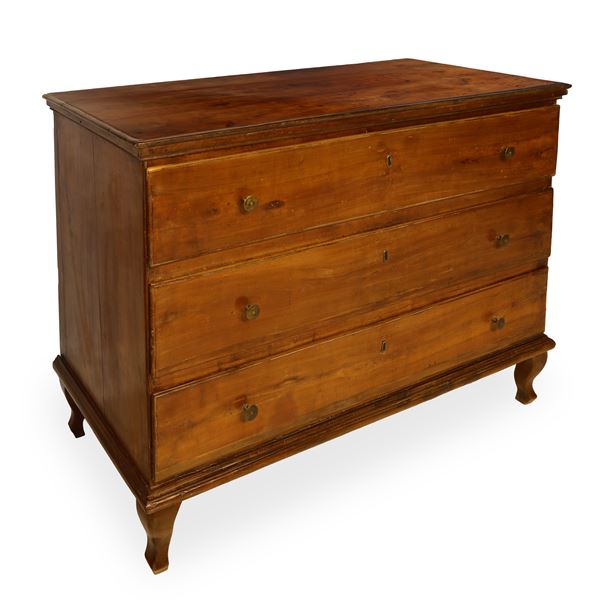 Grande cassettone in legno massello di ciliegio, 3 cassetti, piedi a capriole, Veneto XVIII secolo