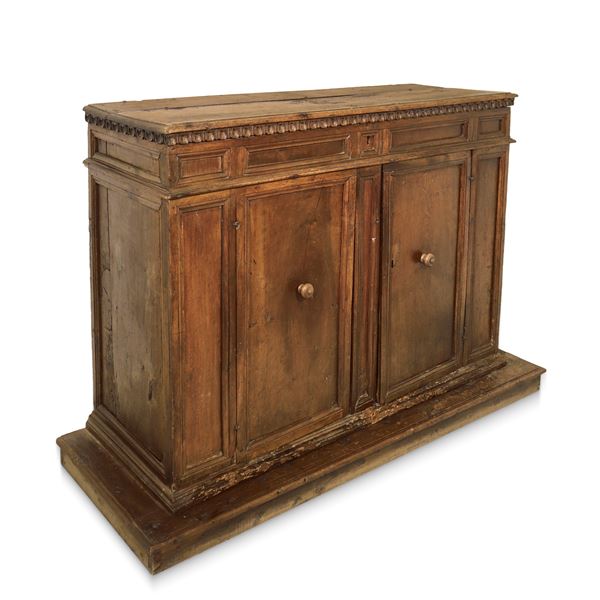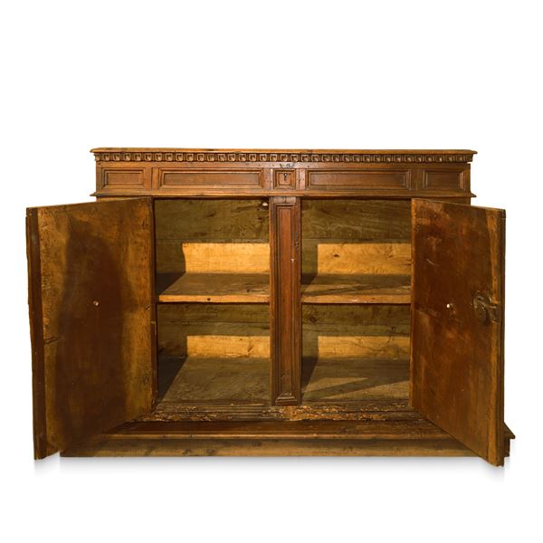 Grande credenza bassa in legno di noce, piano a becco di civetta sottolineato da dentellatura intagliata, due ante con gangheri cornice alla base, cassetto al sottopiano, due sportelli, Fine XVIII secolo