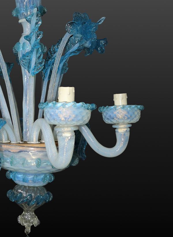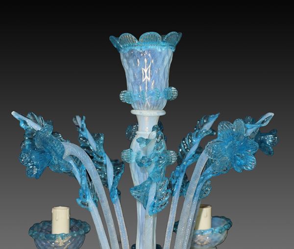 Lampadario in vetro di Murano azzurro a 5 luci, XIX secolo