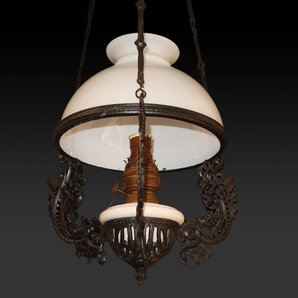 Lampadario sali e scendi in opaline bianca con serbatoio a petrolio