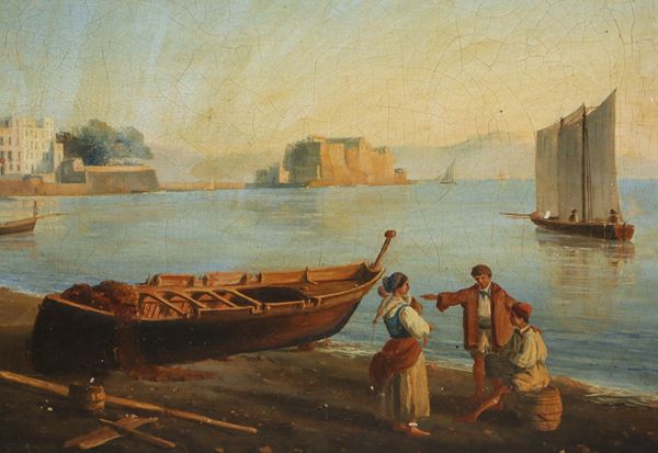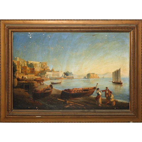 Marina di Napoli con castello, barche e personaggi, XIX secolo