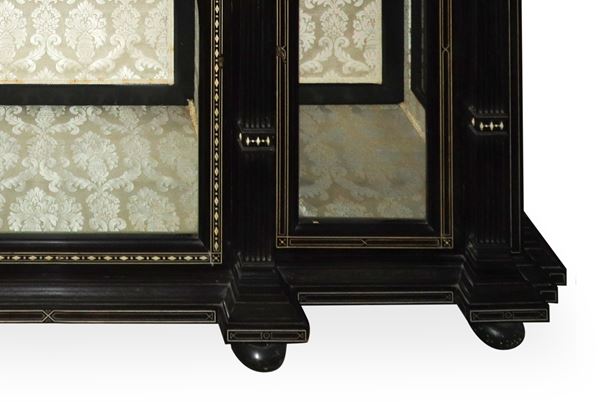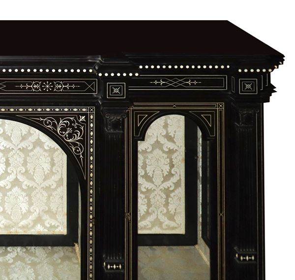 Mobile ebanizzato nero con intarsi in osso e piedi a cipolla
