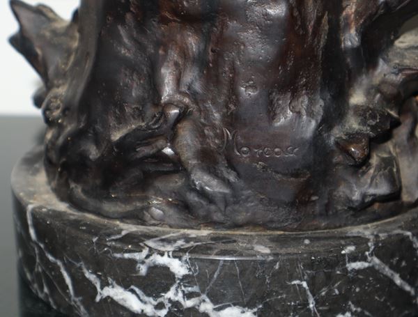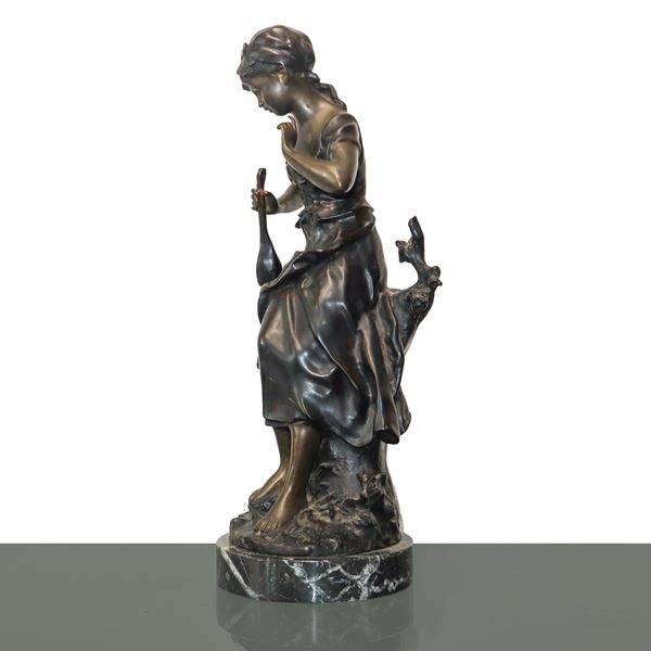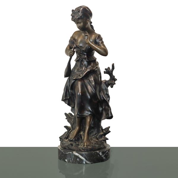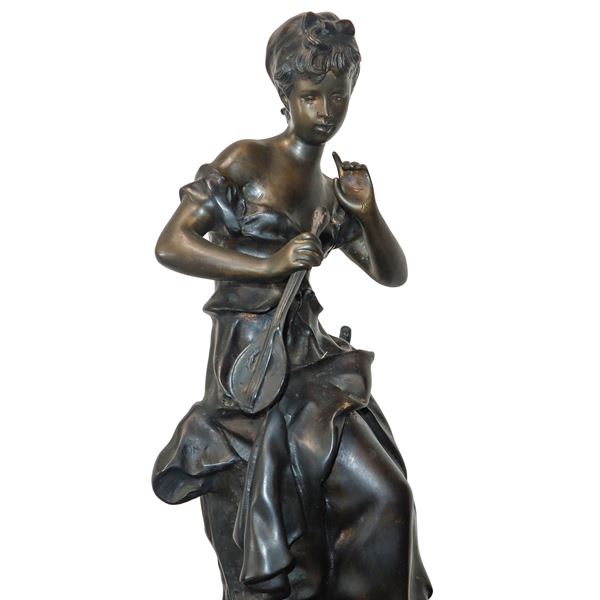 Donna con mandolino, scultura in bronzo con base in marmo grigio bardiglio