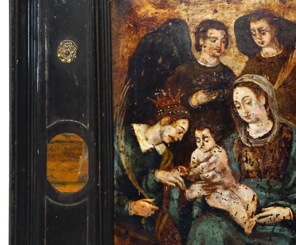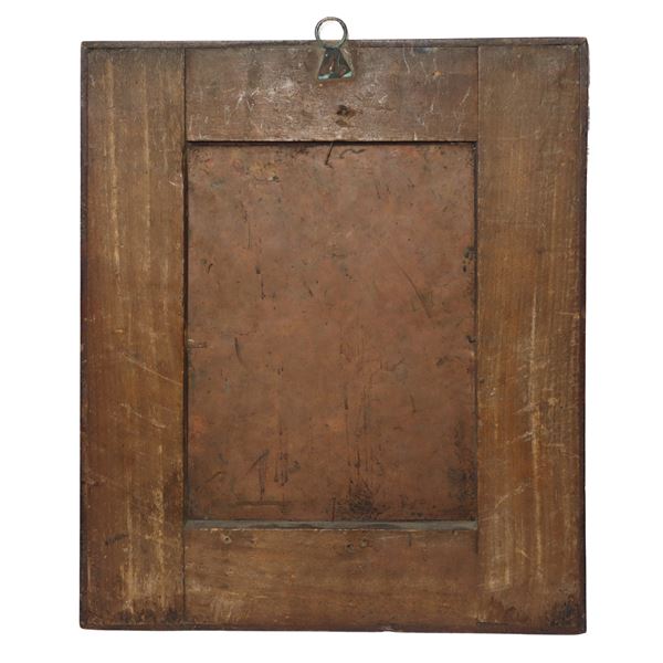 Cornice nera ebanizzata e inserti in marmo di Siena, marmo di Verona e agata. Bambino Gesù in bronzo dorato applicato in testa alla cornice e fiori dorati ai bordi.