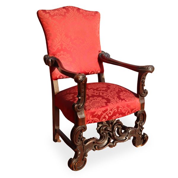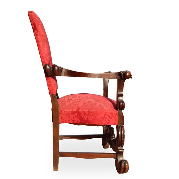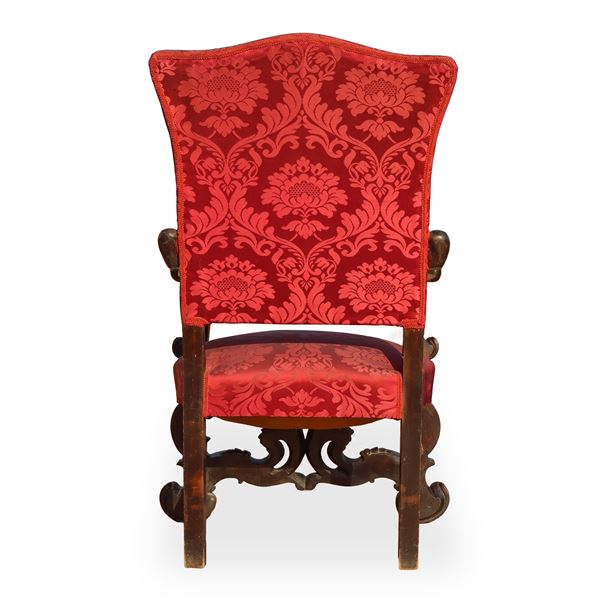 Poltrona con spalliera alta e tappezzeria rossa damascata, XVIII secolo