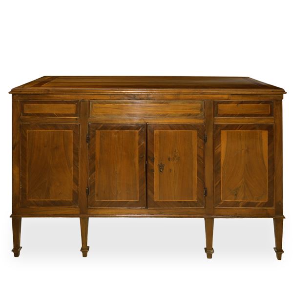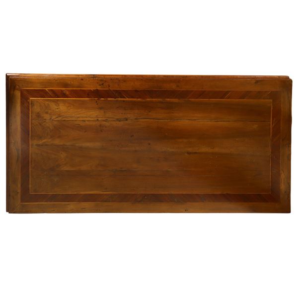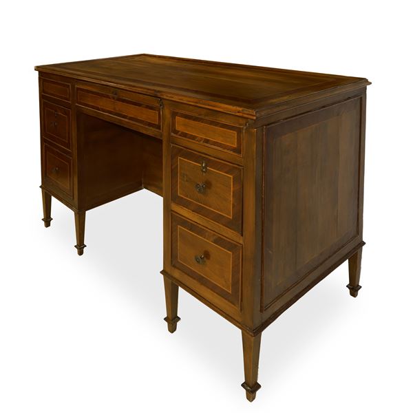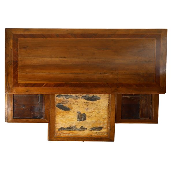Scrittoio in legno di noce e inserti in palissandro con piano superiore a scorrimento e scomparto posteriore con antina e serratura, cassetto centrale e cassetti ai lati piedi troncopiramidali, XIX secolo