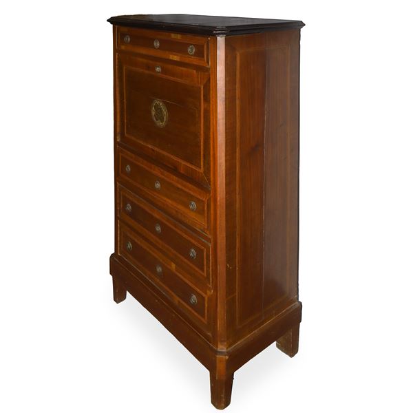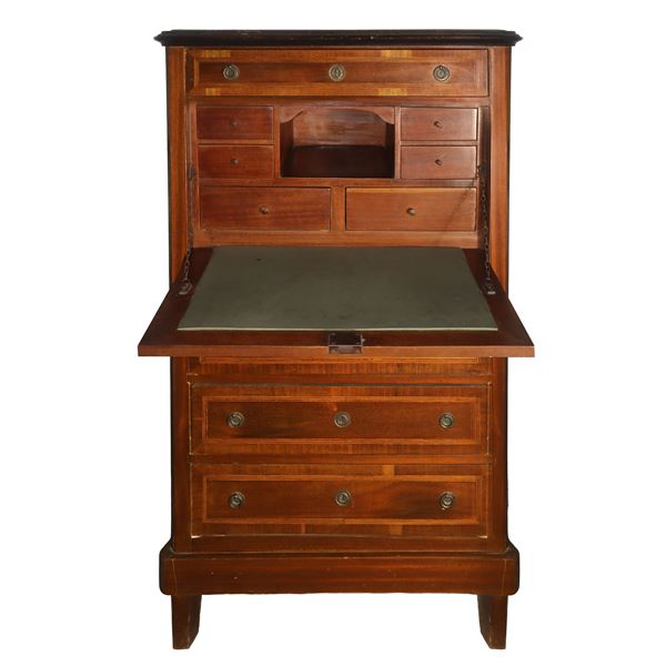 Secretaire con cassetto in testa, abattande centrale a copertura di cassettiera interna e tre cassetti bassi. Intarsi e filettature sul fronte, XIX secolo