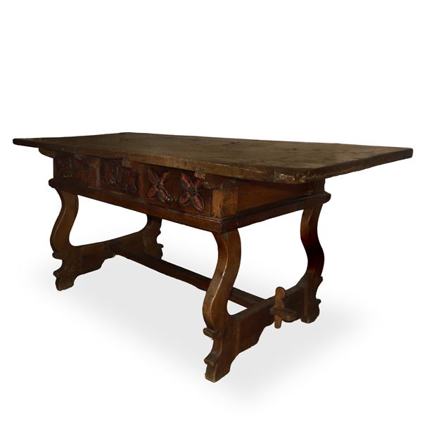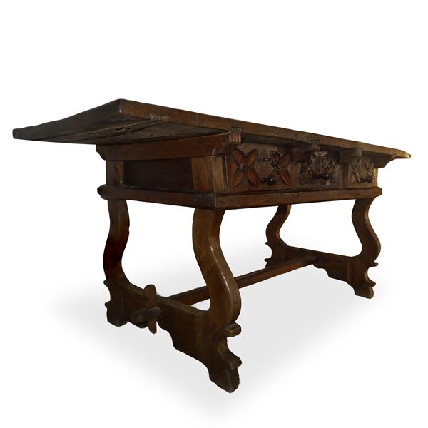 Tavolo con piedi a lira con cassetti e sottopiano intagliato, Catalogna XVII secolo