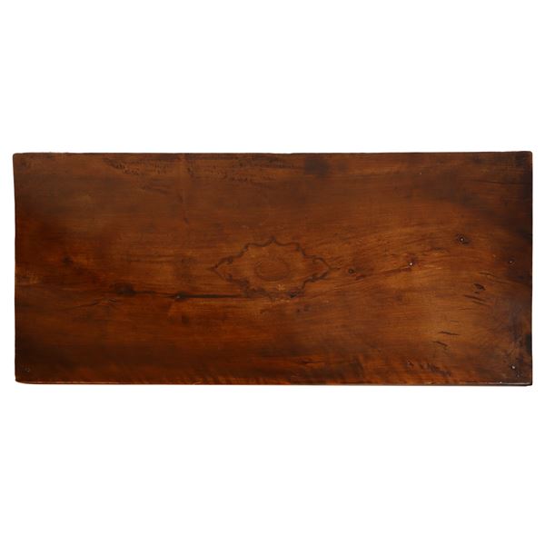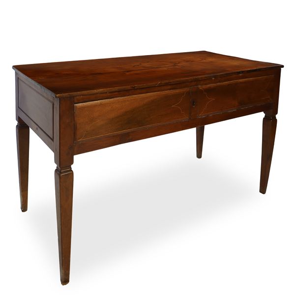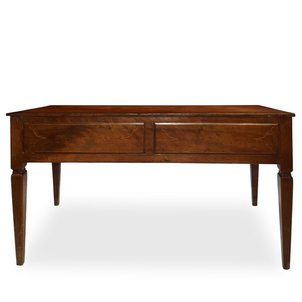 Tavolo in massello di noce con piano e laterali intarsiati con due cassetti e piedi troncopiramidali