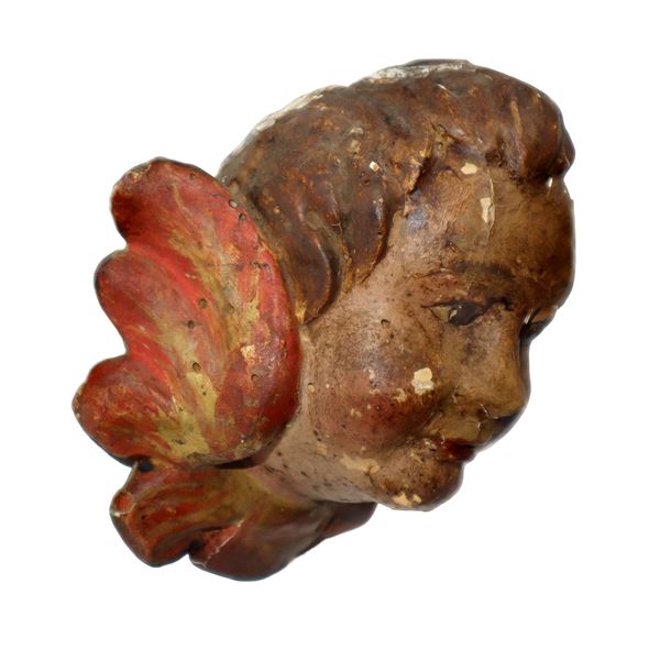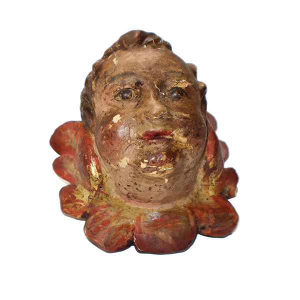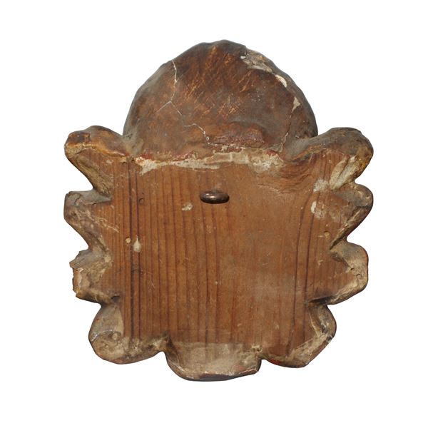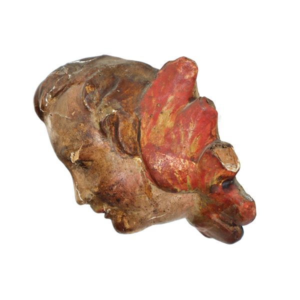 Testa di zefiro scolpita e intagliata in legno e dipinta policroma, XVII Secolo