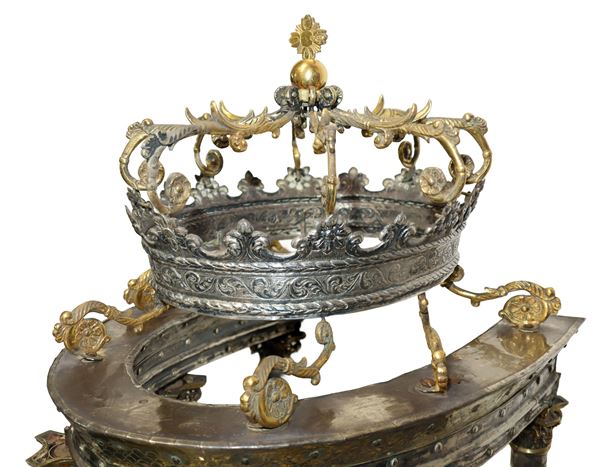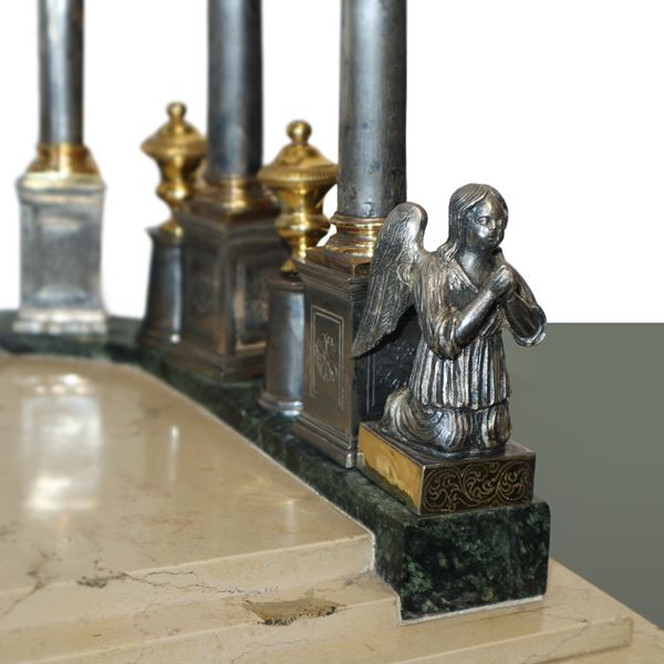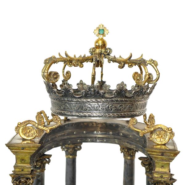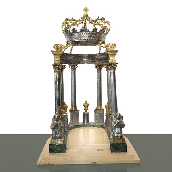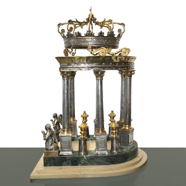 Tronetto per esposizione eucaristica in argento con angeli, colonne e corona, su base in marmo verde, XVI secolo