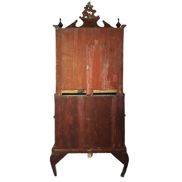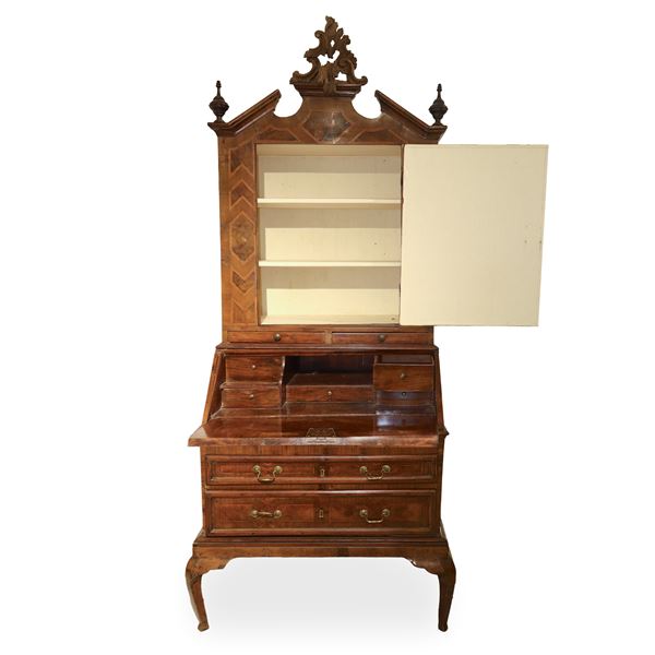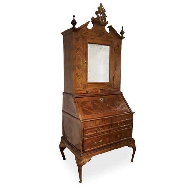 Corpo superiore con anta a specchio, sormontato da cimasa a timpano spezzato, ribalta con giochi di legno. In basso due cassetti con maniglie dorate. Piedi a capriolo