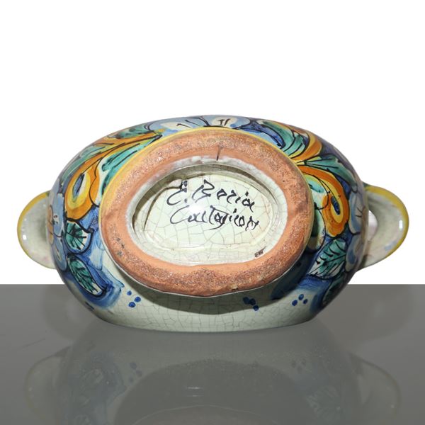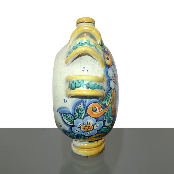 Borraccia in maiolica di Caltagirone smaltata e dipinta policroma con pavone sul fronte, XX secolo