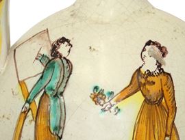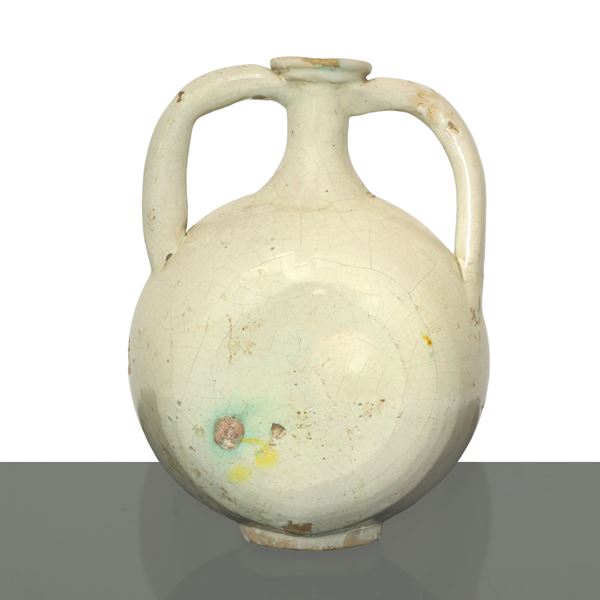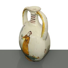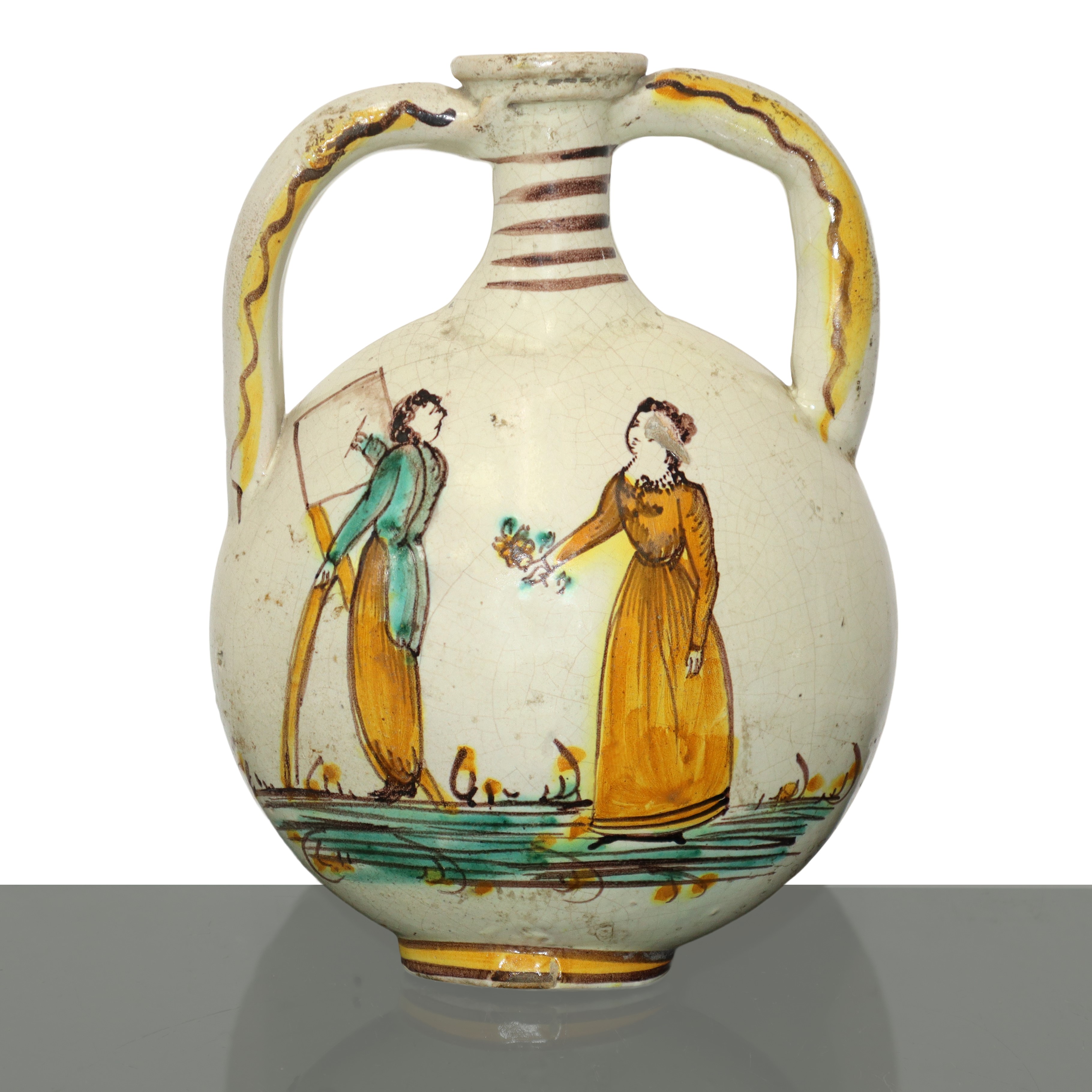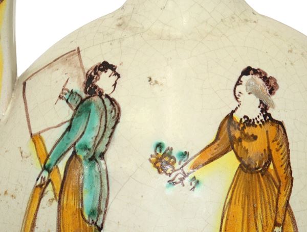 Borraccia in maiolica di Caltagirone dipinta policroma con figura femminile ritratta da un pittore, XIX SECOLO