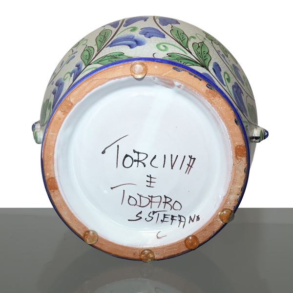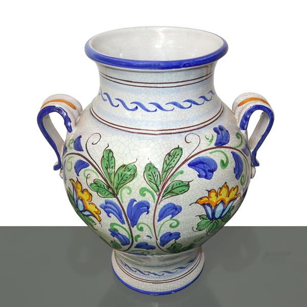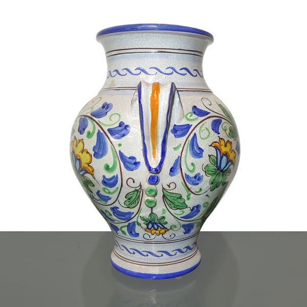 Anfora biansata in maiolica di Santo Stefano di Camastra dipinta policroma e decorata a motivi floreali, XX secolo
