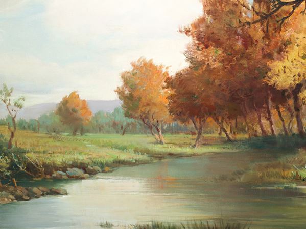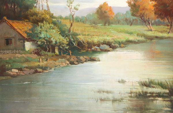 Paesaggio fluviale con alberi e casa