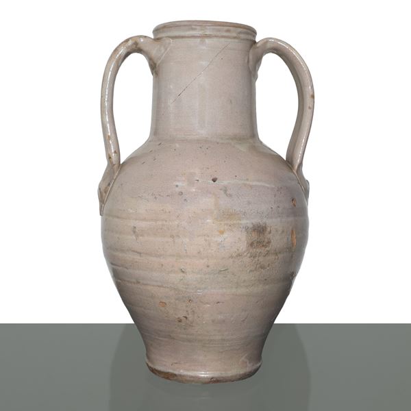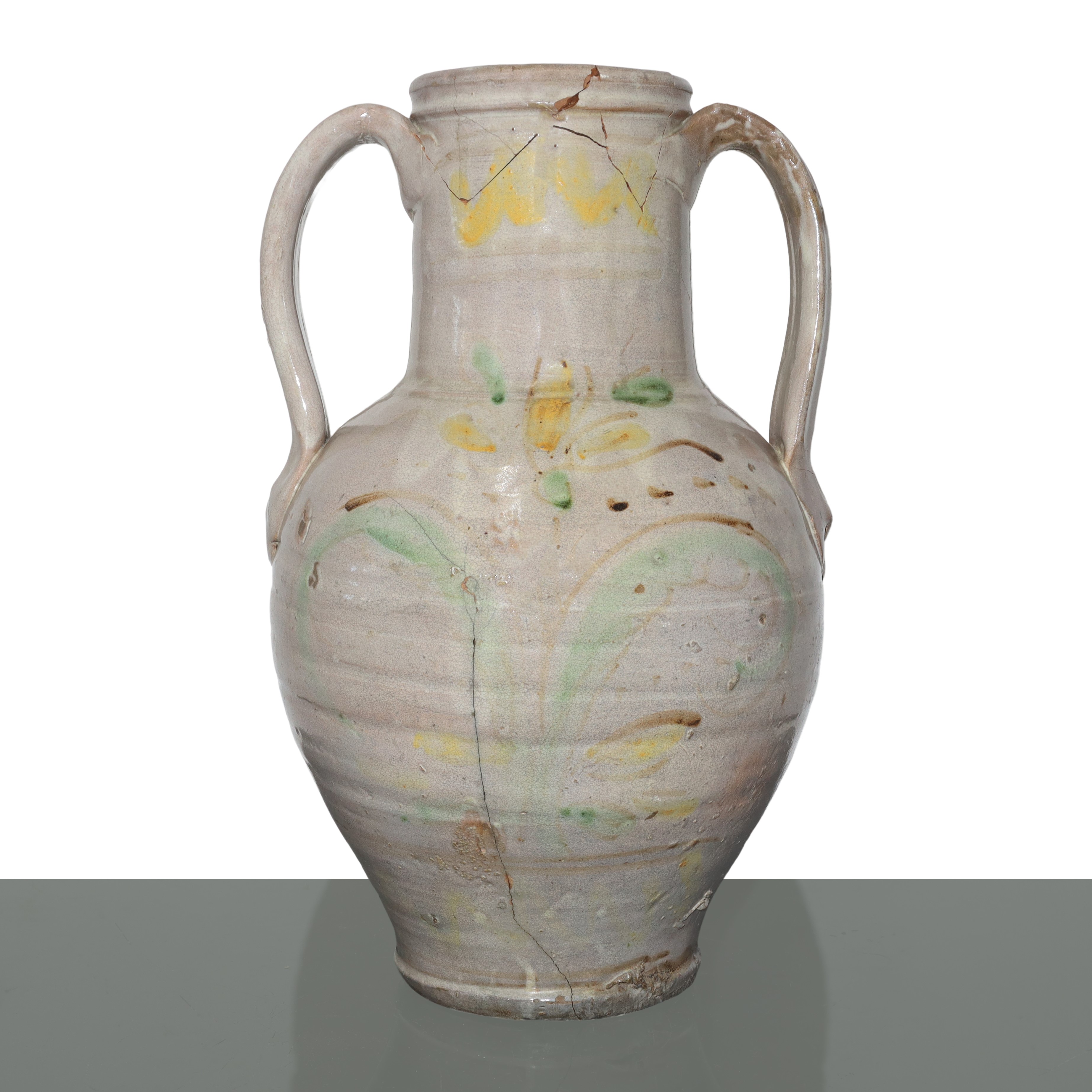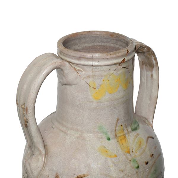 Quartara in maiolica di Caltagirone invetriata bianca con fiore policromo sul fronte