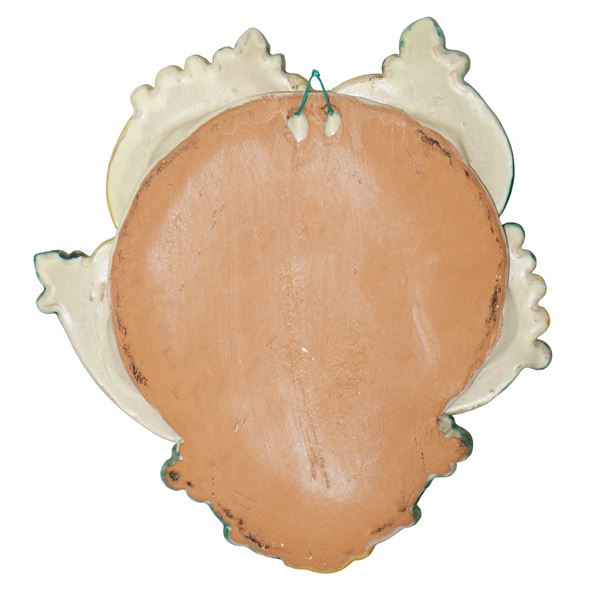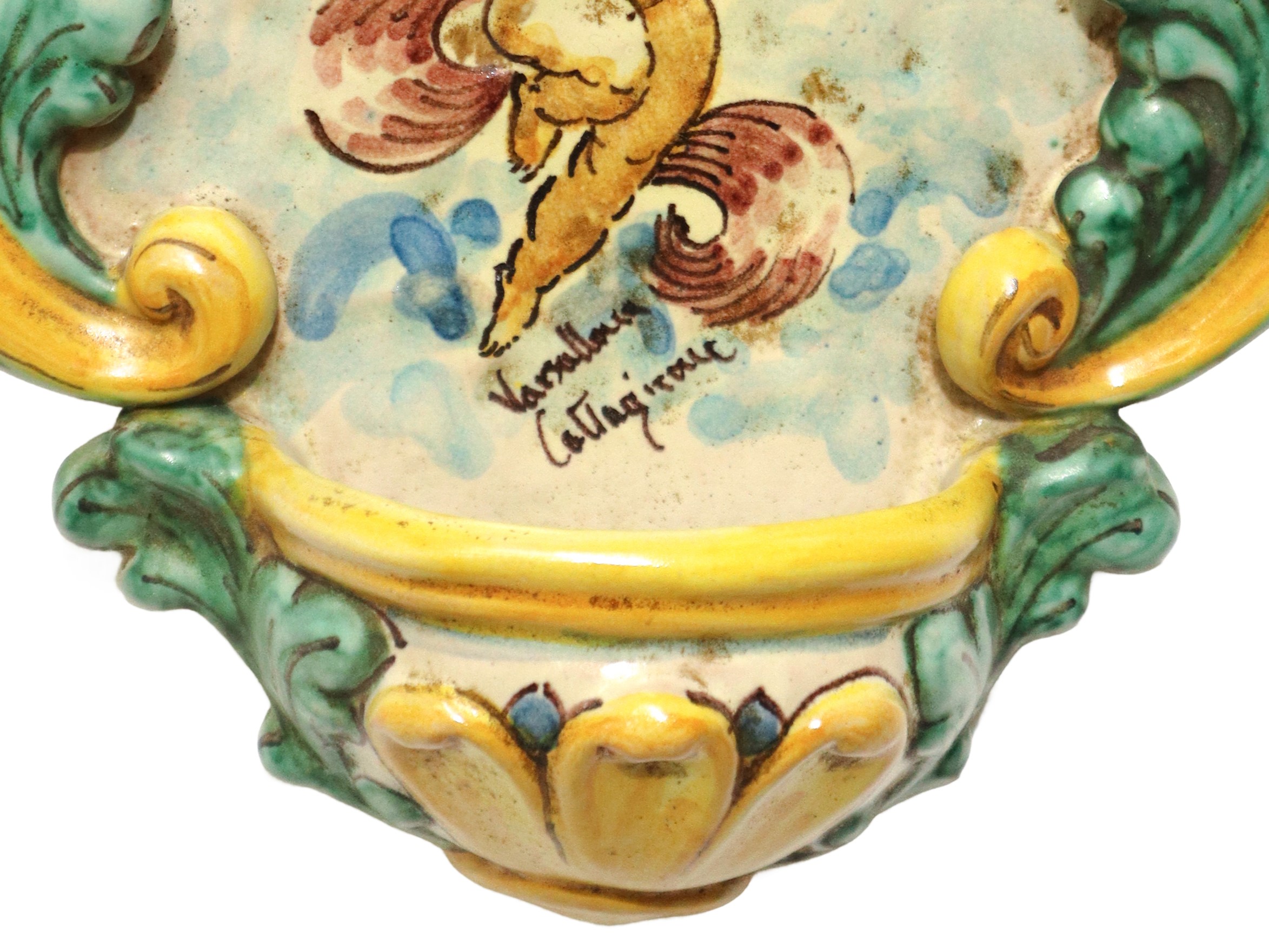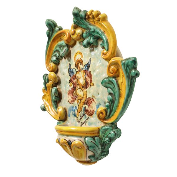 Acquasantiera in maiolica di Caltagirone dipinta policroma con raffigurazione di un putto