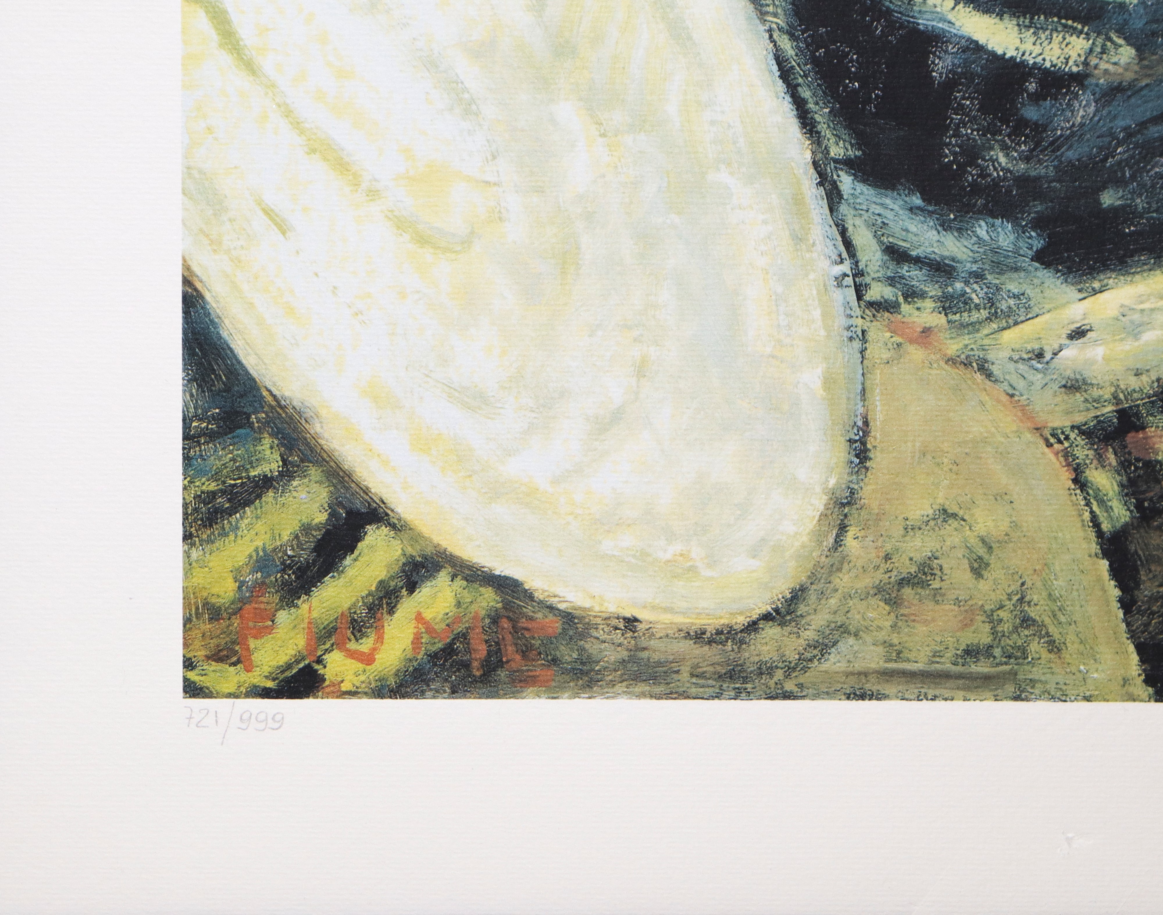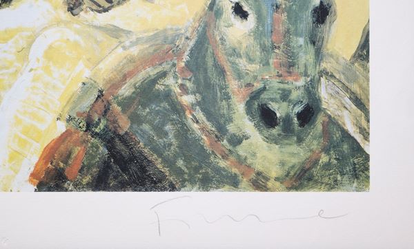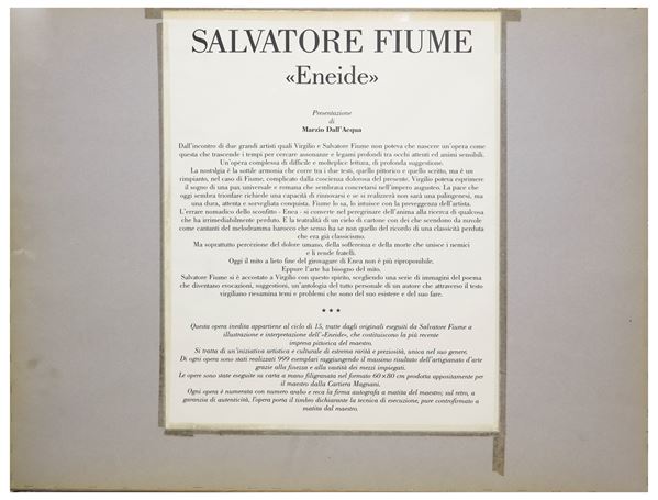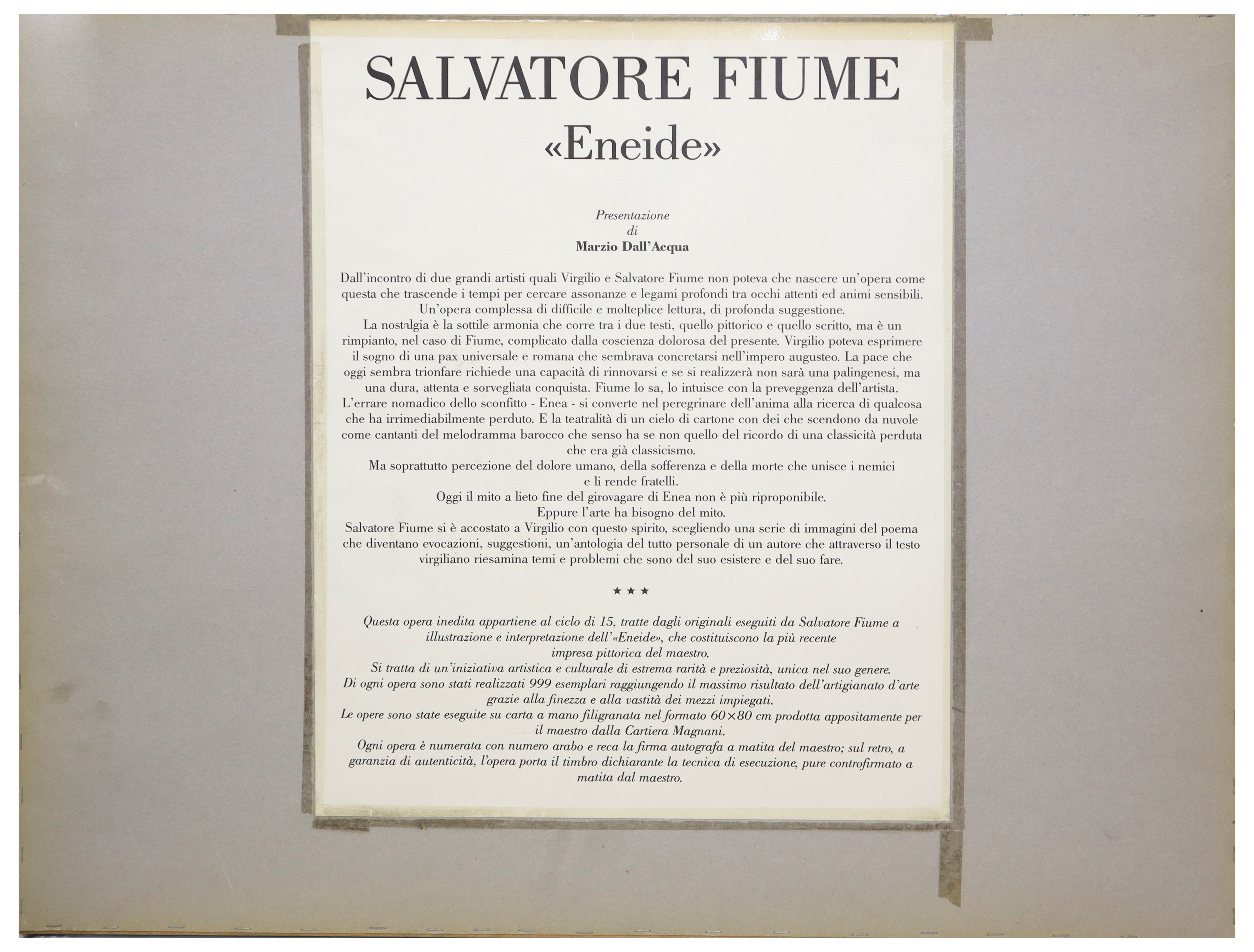 Opera inedita che appartiene al ciclo di 15. Carta filigranata prodotta appositamente per il maestro della Cartiera Magnani. Ogni opera è numerata con numero arabo e reca la firma autografa a matita del maestro; sul retro, a garanzia di autenticità, l'opera porta il timbro dichiarante la tecnica di esecuzione, pure controfirmato a matita del maestro.