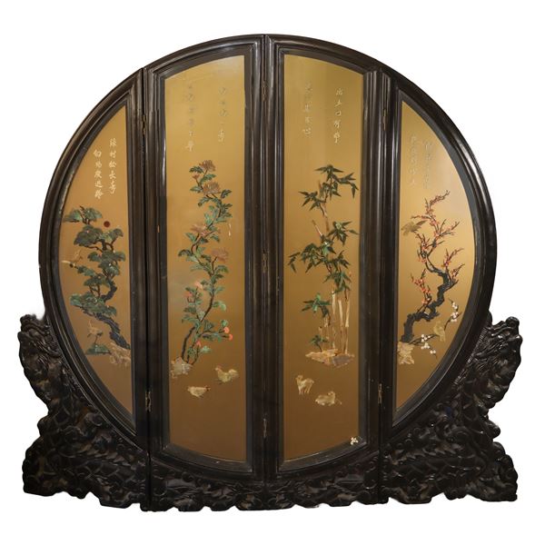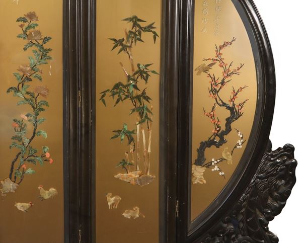 Grande paravento cinese circolare a 3 ante con decori floreali e iscrizioni