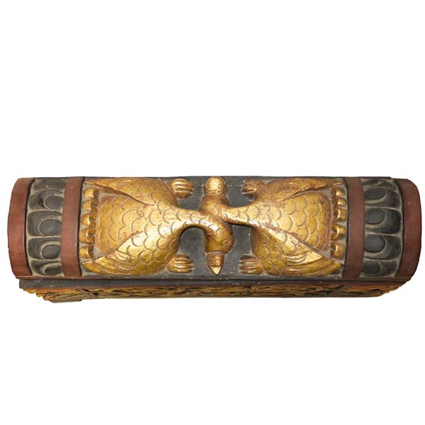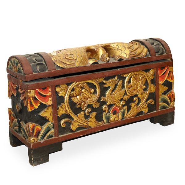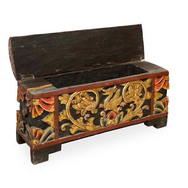 Scrigno balinese per offerte in legno intagliato con volatili e motivi floreali e dipinto policromo