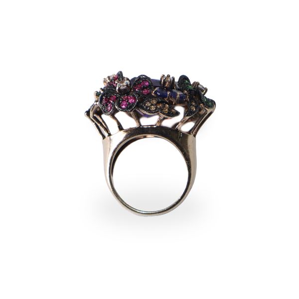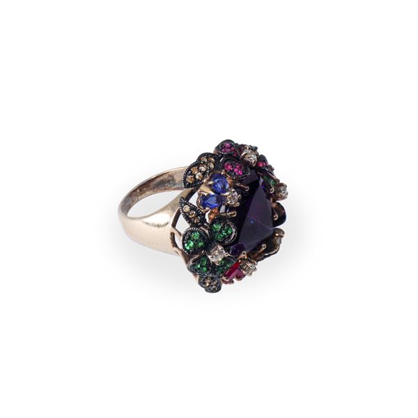 Anello in argento 925 con pietre multicolor e pietra viola centrale