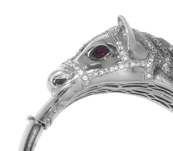 Bracciale rigido con apertura a scatto e chiusura di sicurezza a forma di cavallo in metallo argentato e strass