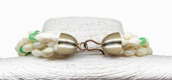 Collana a 5 fili di avariolina bianca intramezzati da sferette in giada verde riscaldata con chiusura in argento placcata in oro