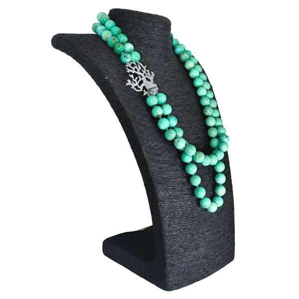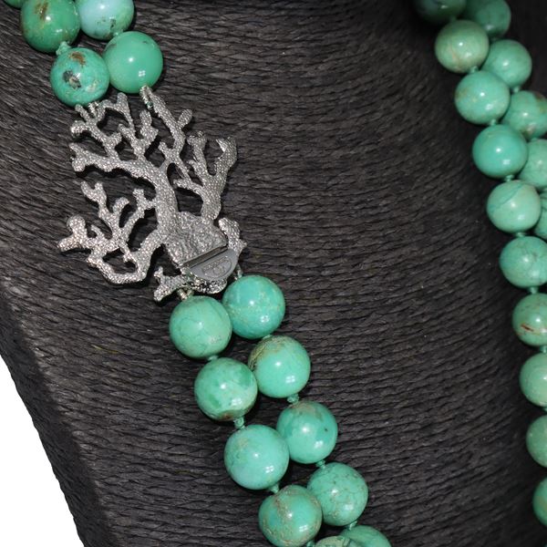 Collana a due fili di crisoprasio a sfere lucide, chiusura in argento dalla forma di ramo di corallo