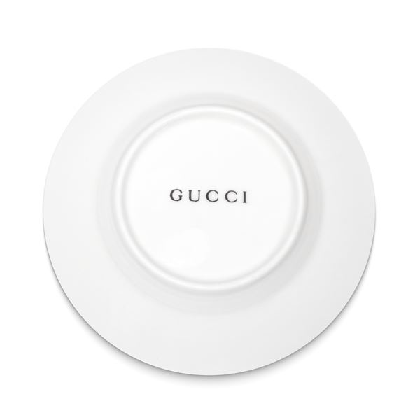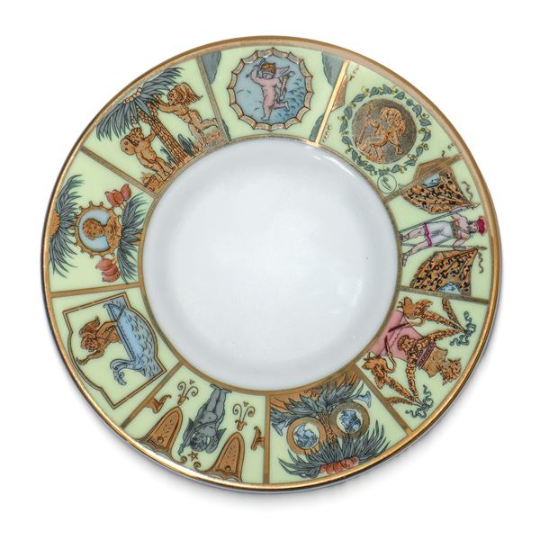 Servizio da caffè con sei tazze con piattini in porcellana con finiture oro e disegni pompeiani