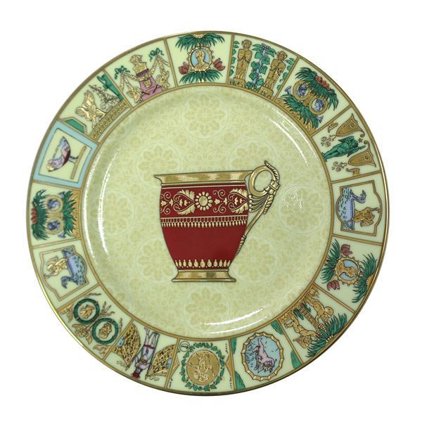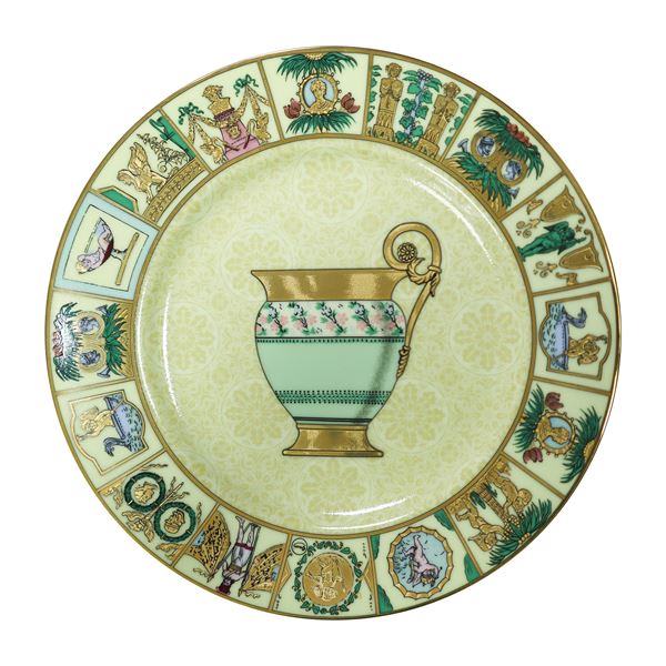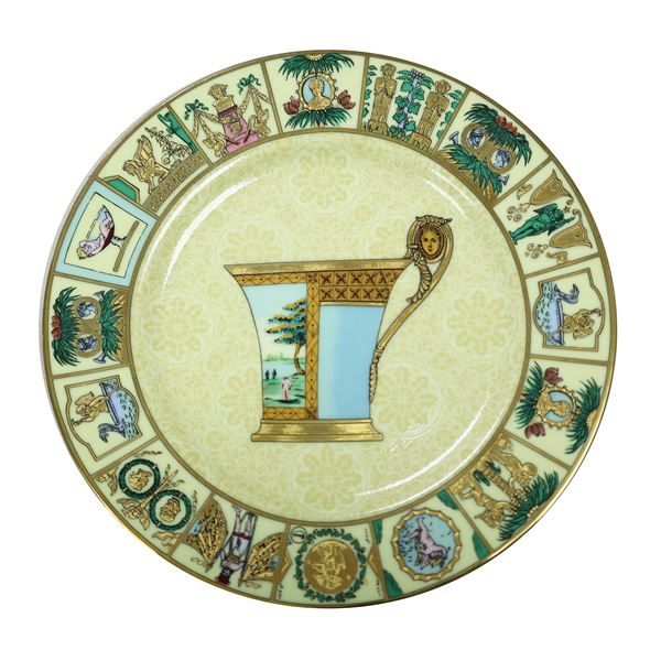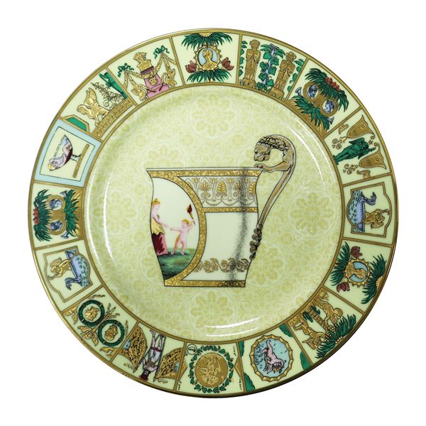 Set di quattro piatti da parete in porcellana con decorazione multicolore e dorata, Anni 80