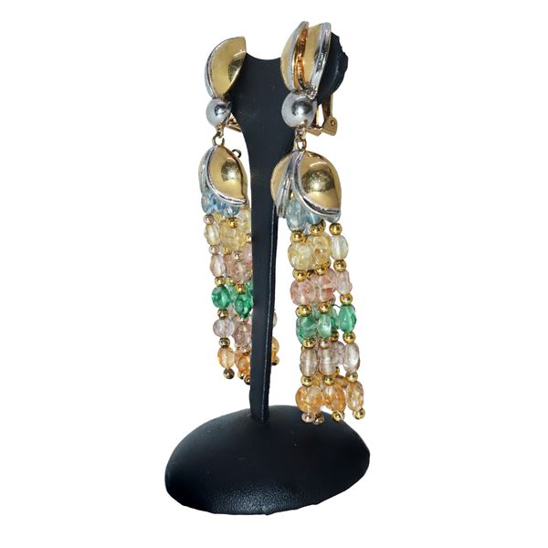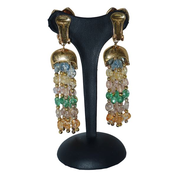Orecchini pendenti a clip in metallo dorato con 6 fili di pietre colorate