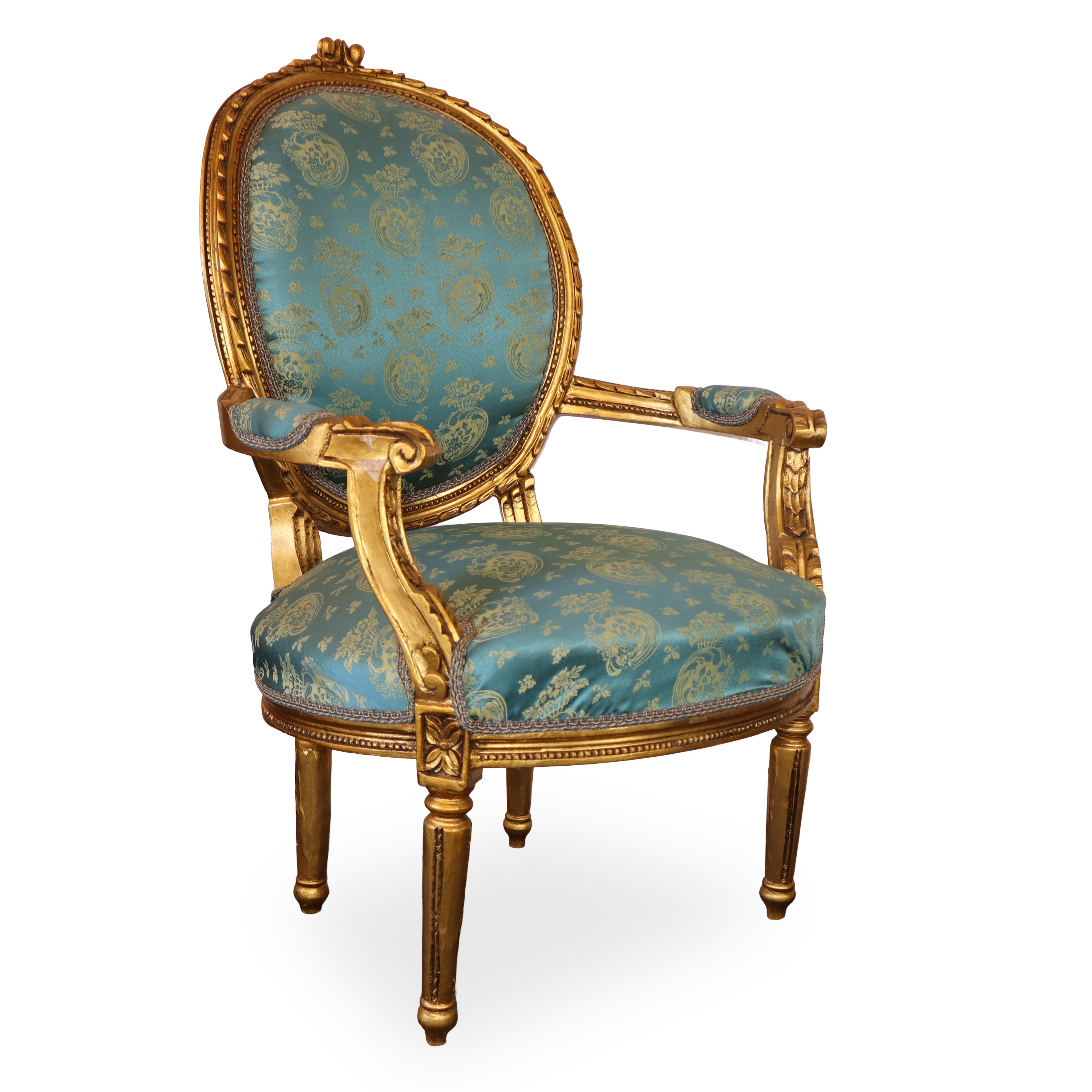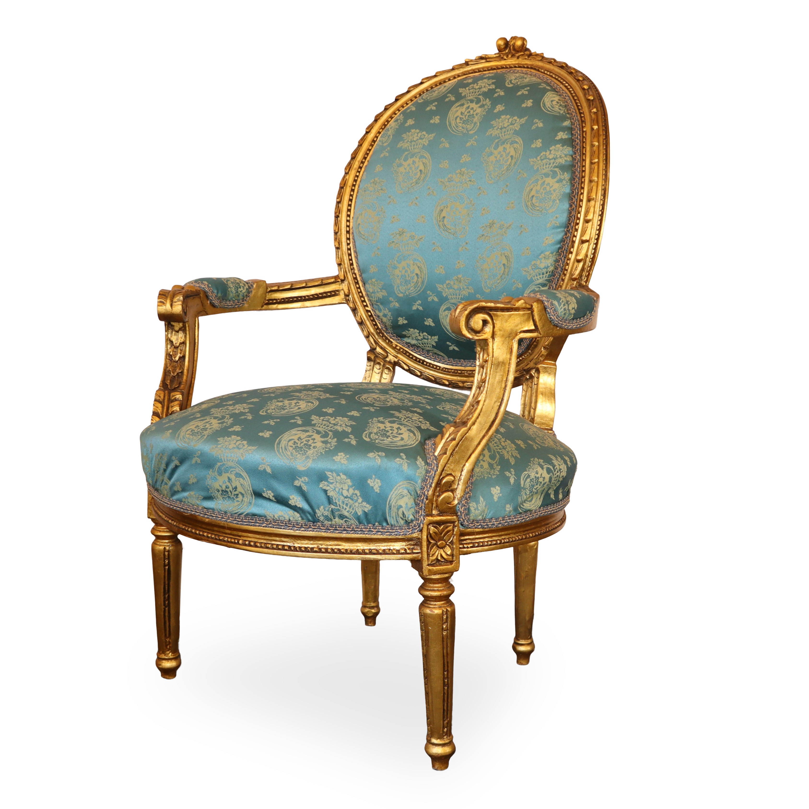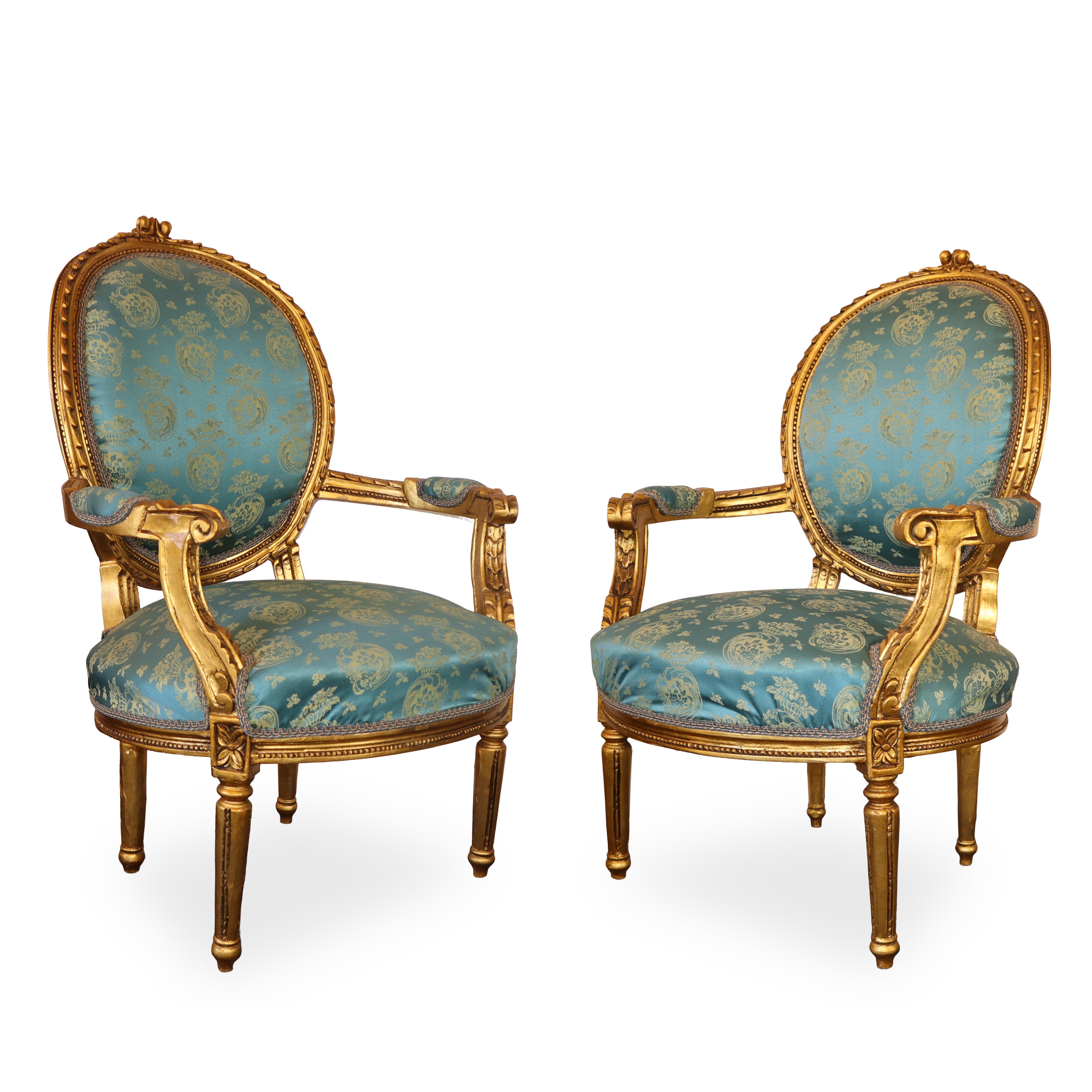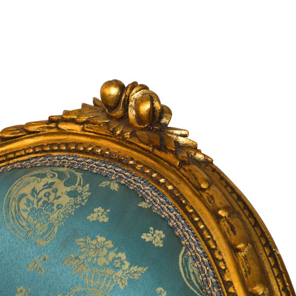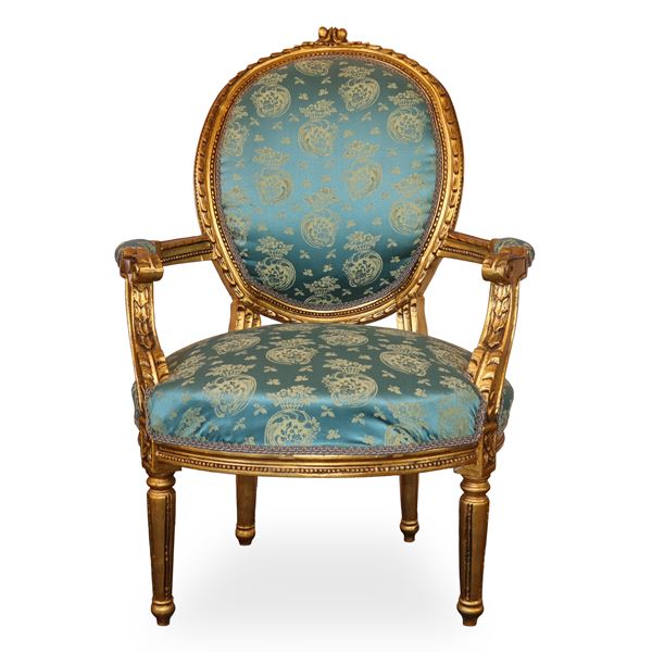 Coppia di poltrone in legno dorato con tappezzeria blu, XX secolo