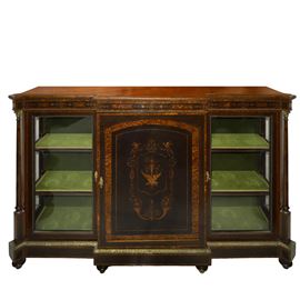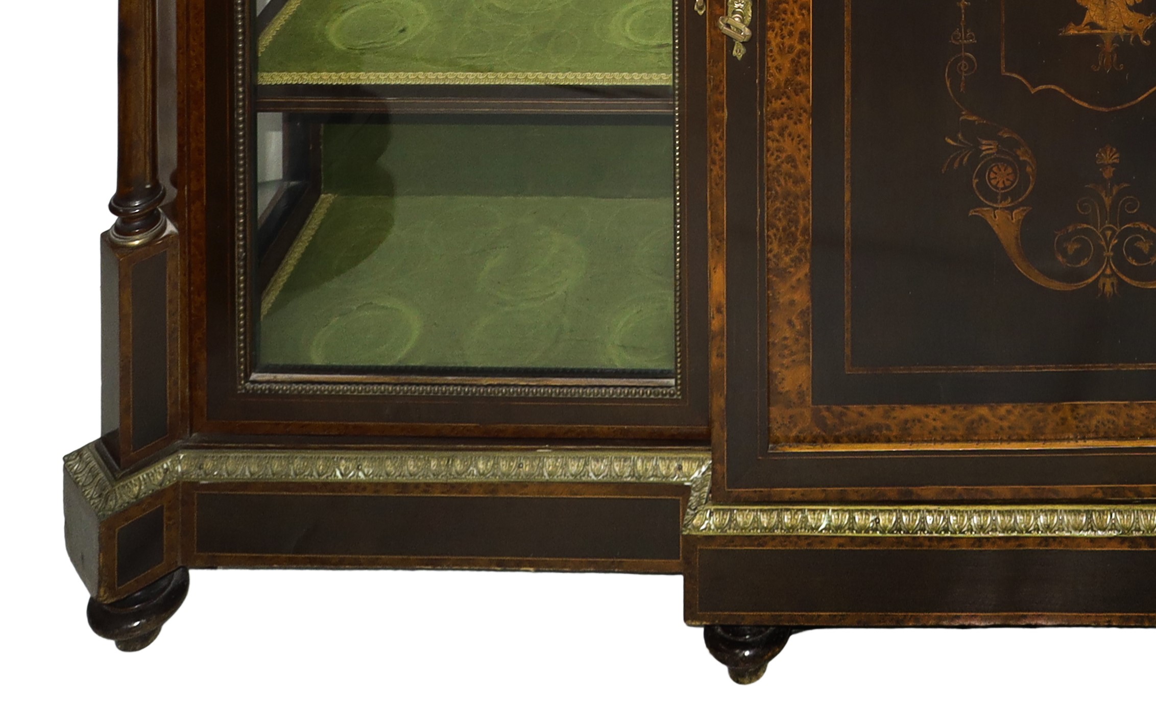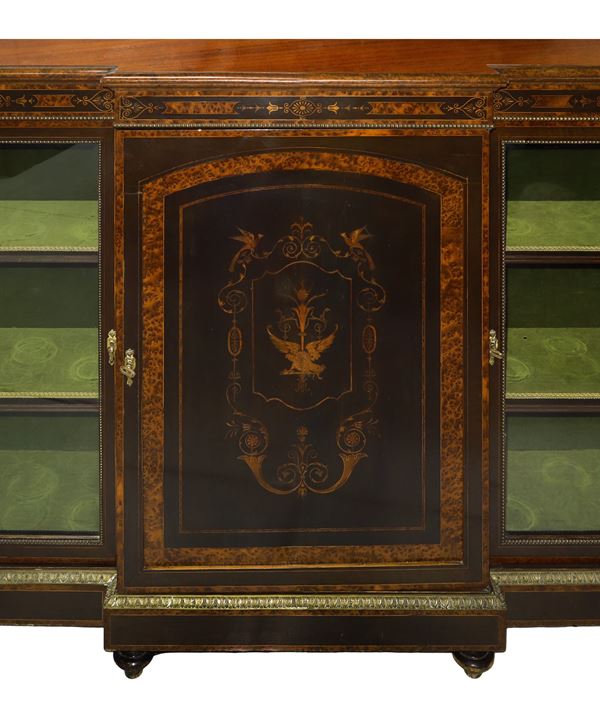 sportello centrale in legno intarsiato e sportelli laterali a vetri con sportello centrale intarsiato e colonne ai lati