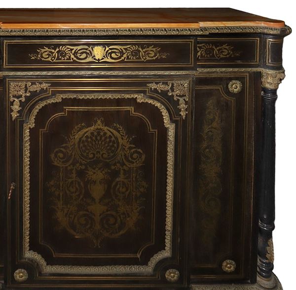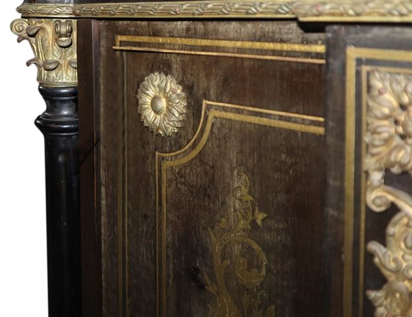 Con intarsi in rame dorato e bronzi applicati allo sportello e alle cornici, colonne nere con capitelli dorati ai lati. Marmo al piano